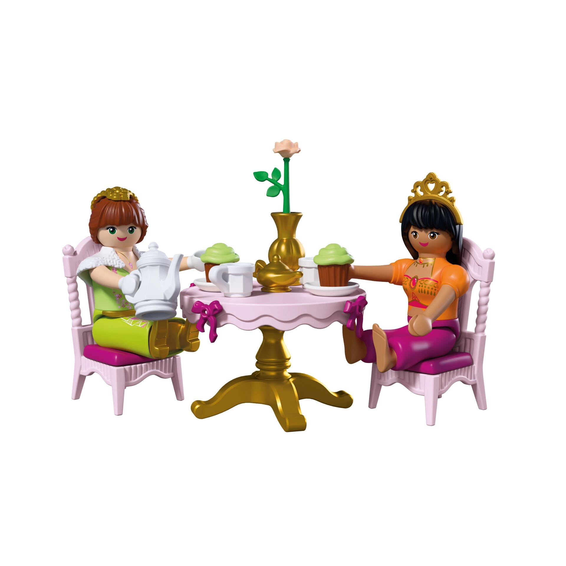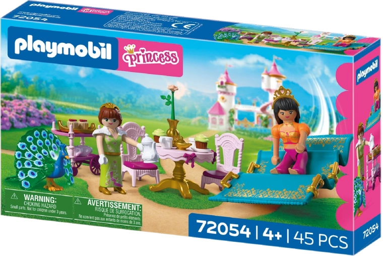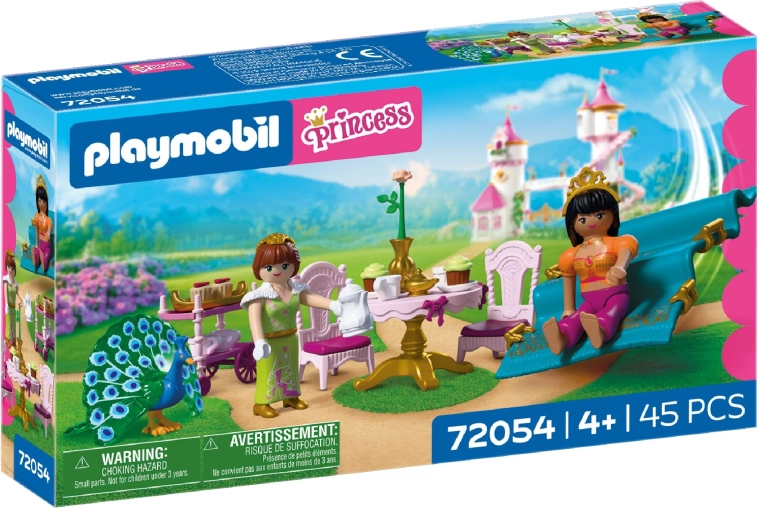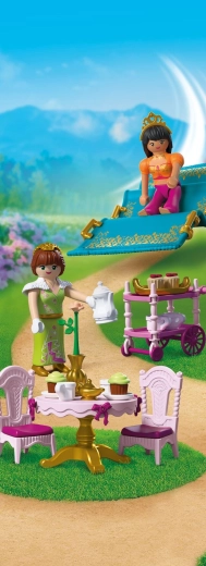 Scufundați-vă în lumea basmelor cu setul PLAYMOBIL, unde prințesa își întâmpină prietena la un ceai stilat în grădină. Covorul zburător asigură o sosire spectaculoasă, în timp ce masa rotundă, scăunelele și căruciorul de servire creează cadrul perfect pentru oaspeți. Accesoriile detaliate și figurinele articulate îi inspiră pe copii să-și inventeze propriile povești.
