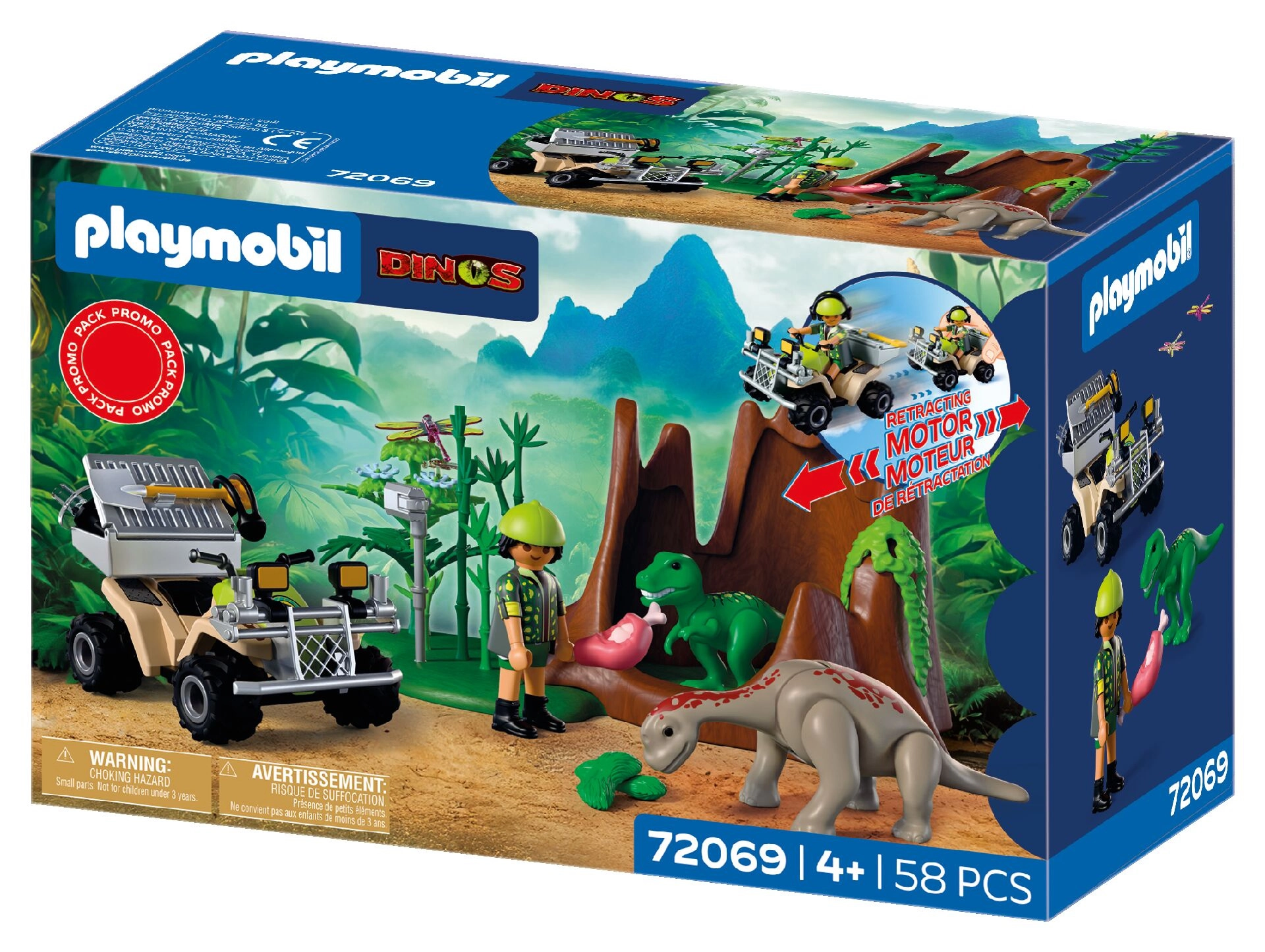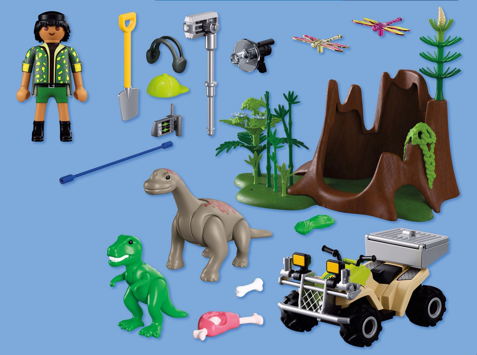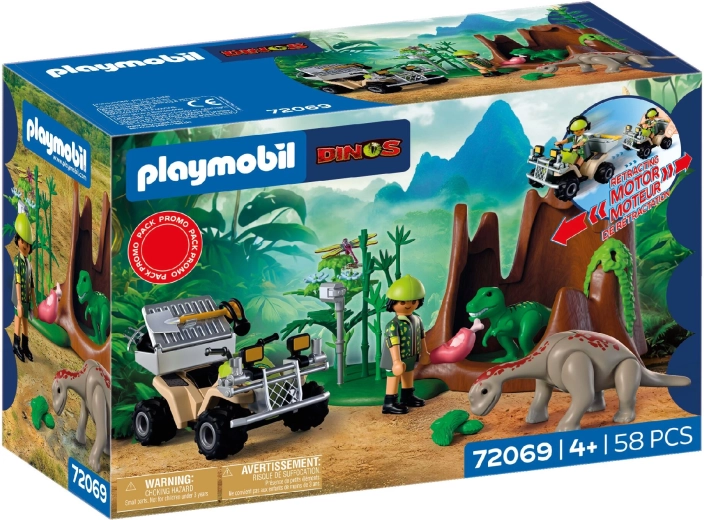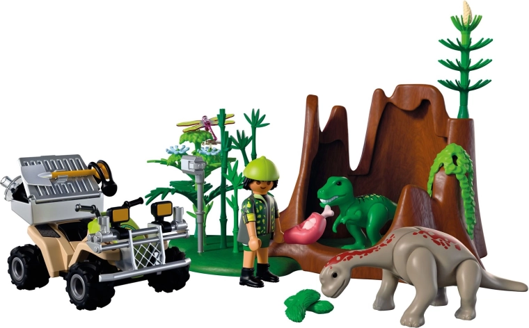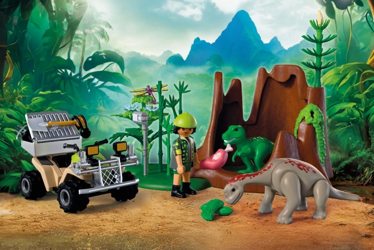 Pornește într-o expediție plină de aventură în lumea dinozaurilor. Cercetătorul, pe robustul ATV cu mecanism de întoarcere (pull-back), străbate vegetația luxuriantă, unde descoperă pui ascunși de T‑Rex și Brachiosaurus. Cu ajutorul echipamentului, documentează sunete, înregistrează comportamente și îi hrănește cu hrană potrivită. Datorită lăzii de transport detașabile și spațiului de depozitare pentru unelte, fiecare misiune este ușoară și bine organizată.