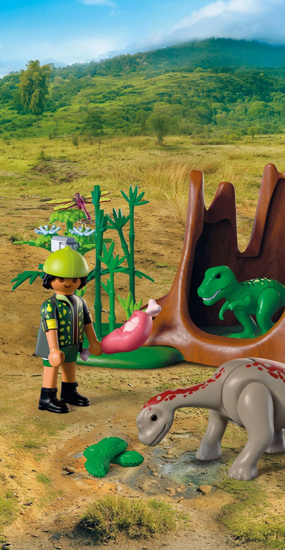Detaliile realiste ale mediului – buturugă, bambuși, flori și vegetație atârnată – împreună cu figurinele de dinozauri îi introduc pe copii în povești pline de suspans. Setul este ideal pentru jocuri de rol și poate fi combinat cu alte seturi PLAYMOBIL pentru o lume și mai mare a aventurilor preistorice.
