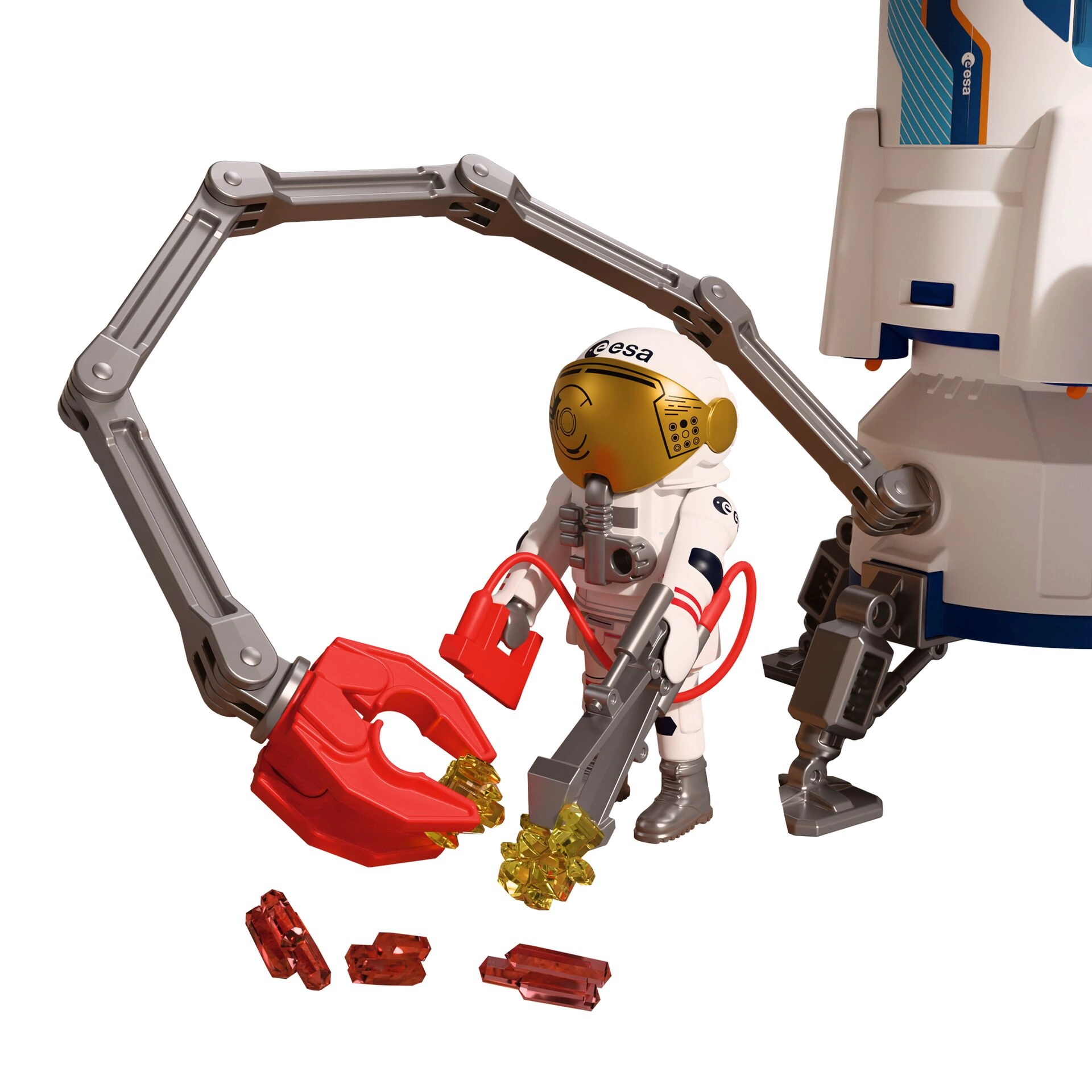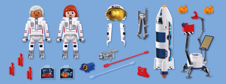 Setul include 2 figurine de astronauți cu căști, protecții speciale și unelte (inclusiv bormașină și clește), plus panou cu celule solare, coș de service, braț robotic cu clește, platformă de lansare și probe de roci marțiene. Ideal ca extindere a universului PLAYMOBIL sau ca set independent pentru micii exploratori de la 4 ani.