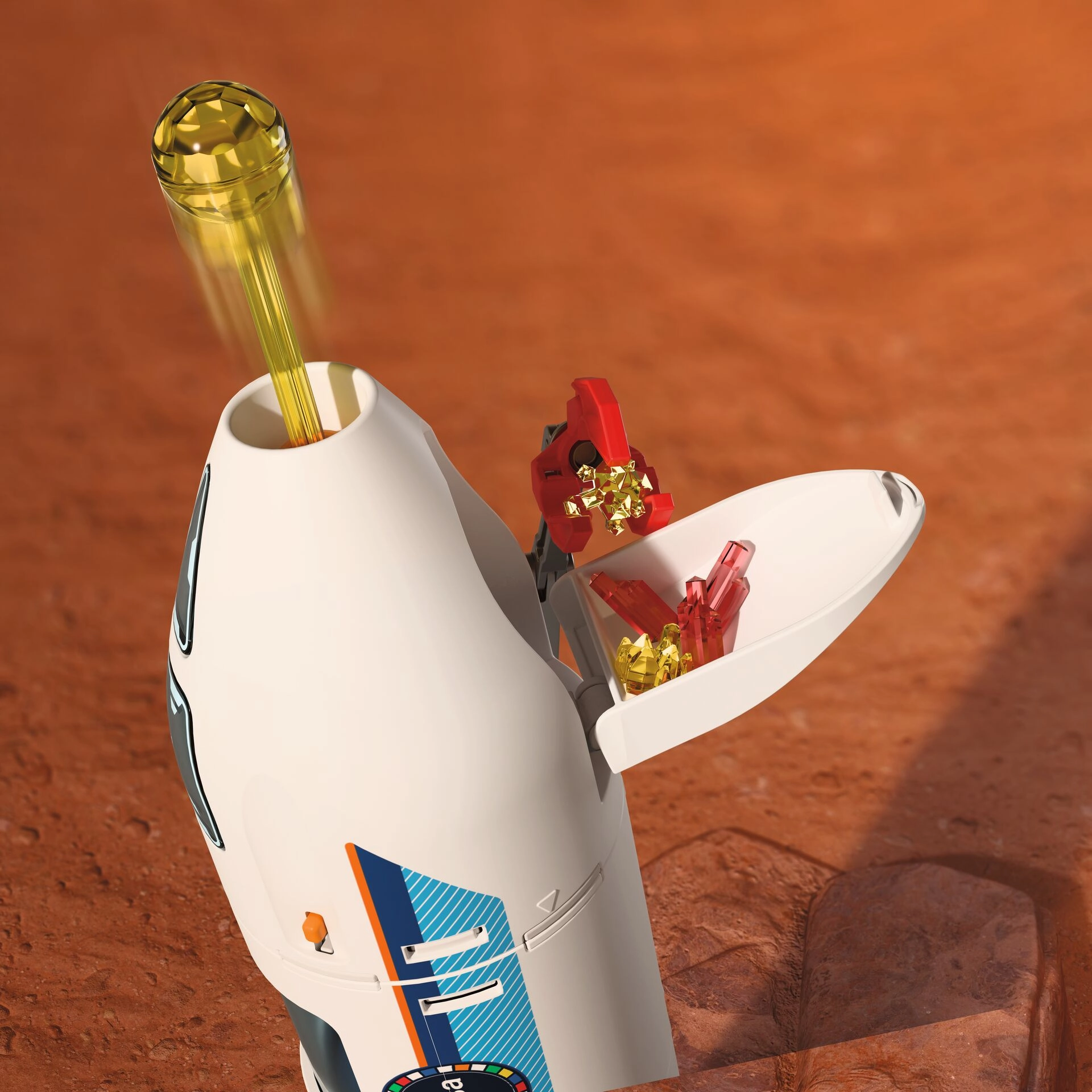 Brațul mobil cu clește prinde ușor rocile și le depozitează în compartimentele rachetei. Ideal pentru misiuni științifice și antrenamentul motricității fine.