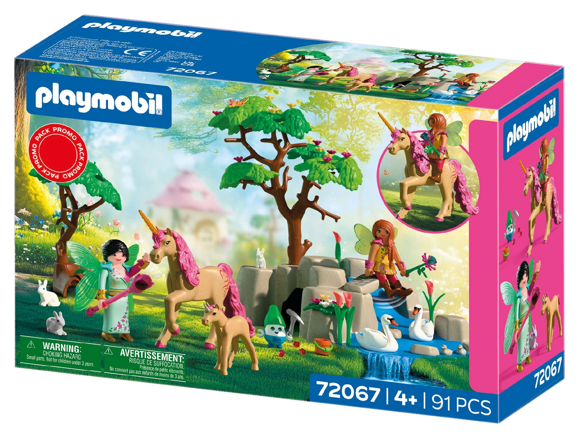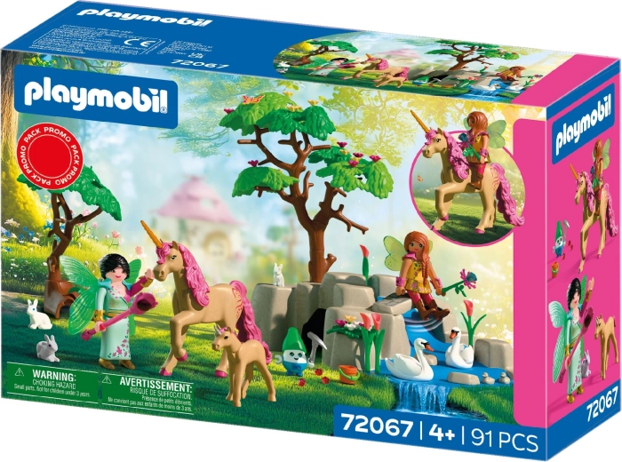 Figurinele zânelor au părți mobile, aripi detașabile și accesorii stilate. Scena cu pod, copaci și pârâu creează o atmosferă magică pentru povestire. Setul este compatibil cu alte seturi PLAYMOBIL, astfel încât copiii își pot construi propria lume a aventurilor.