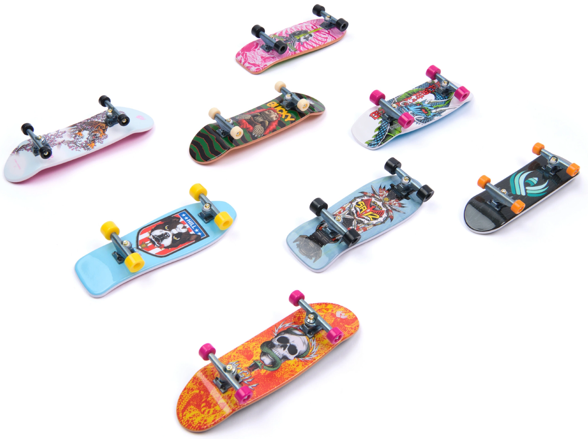 Pachetul include opt fingerboarduri complete, cu imprimeuri colorate și camioane și roți realiste. Grozave pentru colecție și pentru rularea zilnică.