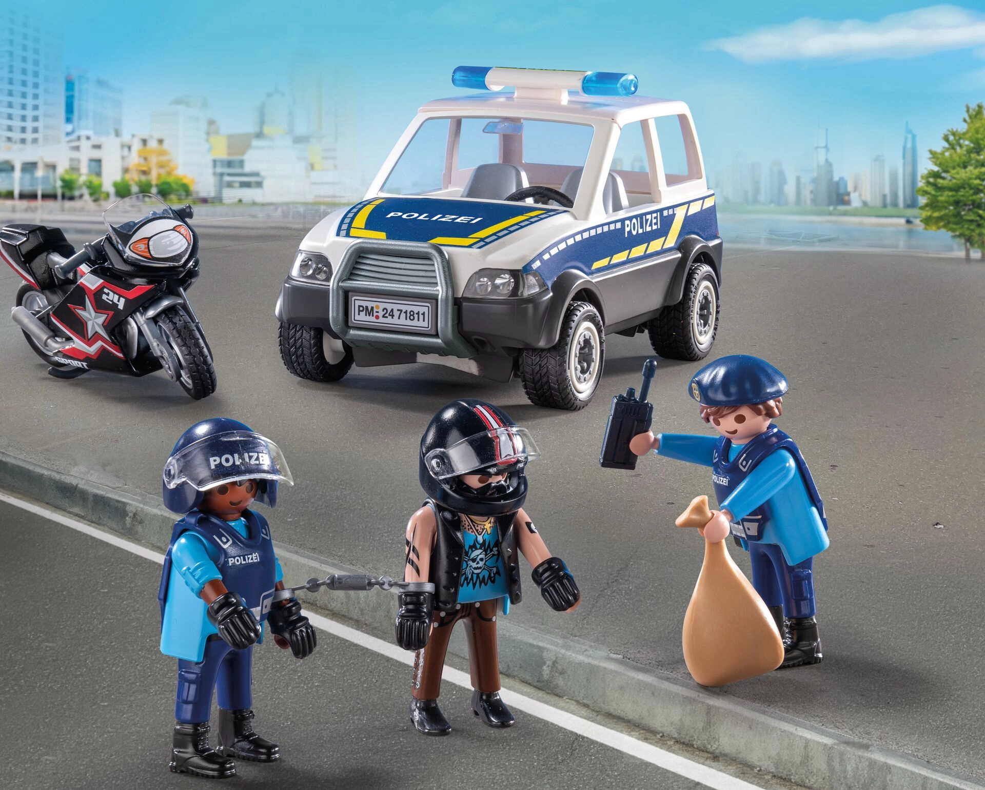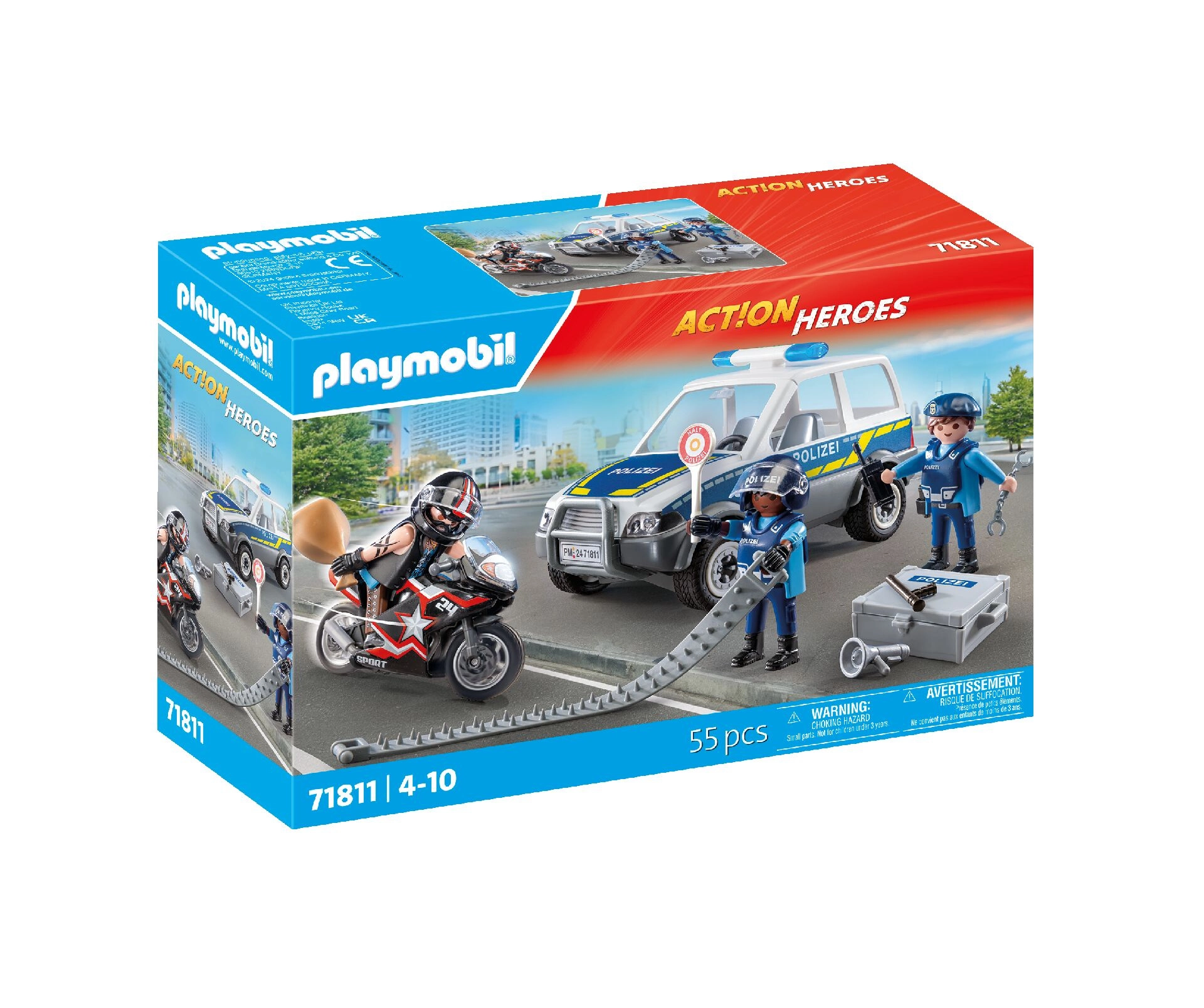 Dați viață imaginației copiilor cu setul dinamic PLAYMOBIL City Heroes – Urmărire polițienească. Curajosul polițist intră în acțiune pentru a prinde hoțul care fuge pe motocicletă, în timp ce infractorul evadează într-o mașină grozavă. Vehiculele realiste, execuția precisă și figurinele mobile asigură o experiență captivantă la fiecare joc.