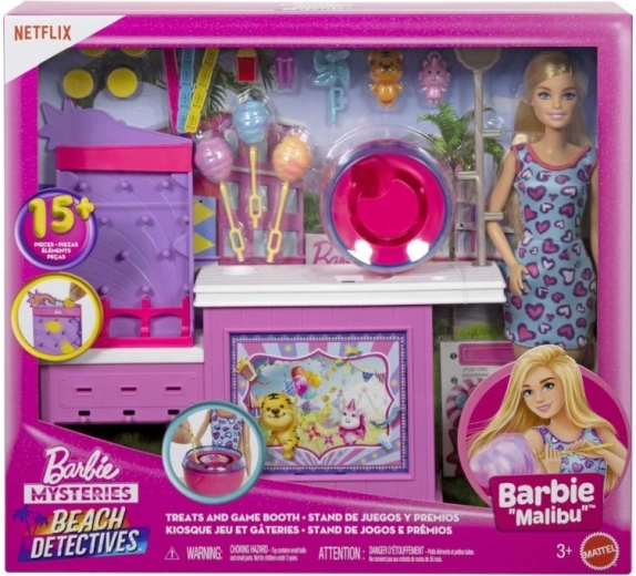 Include păpușa BARBIE „Malibu” în rochiță drăguță cu inimioare, un chioșc realist cu aparat de vată de zahăr, un kiosk de joc cu recompense și un set bogat de accesorii – de la bilete și jetoane la mici „jucării de pluș” și bunătăți dulci. Cadoul ideal pentru micii fani ai poveștilor, care adoră culorile vii, accesoriile detaliate și mecanicile de joc ușor de înțeles.