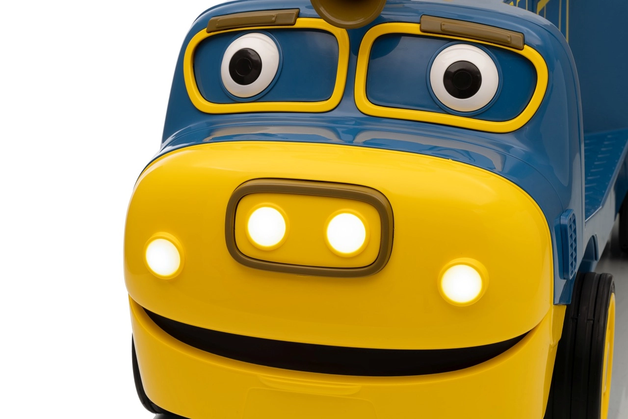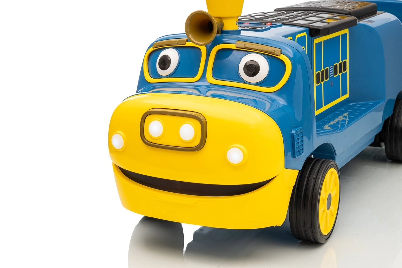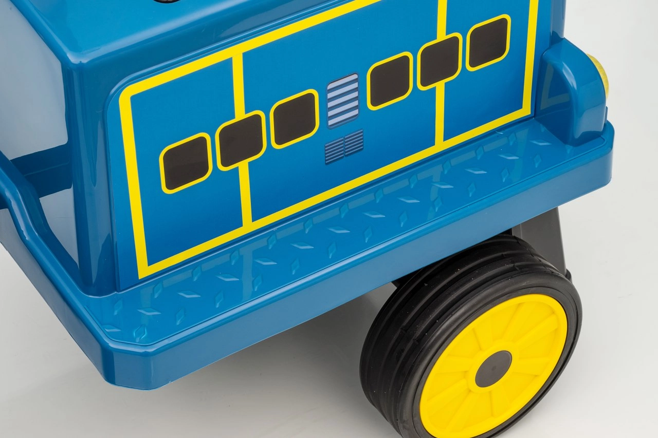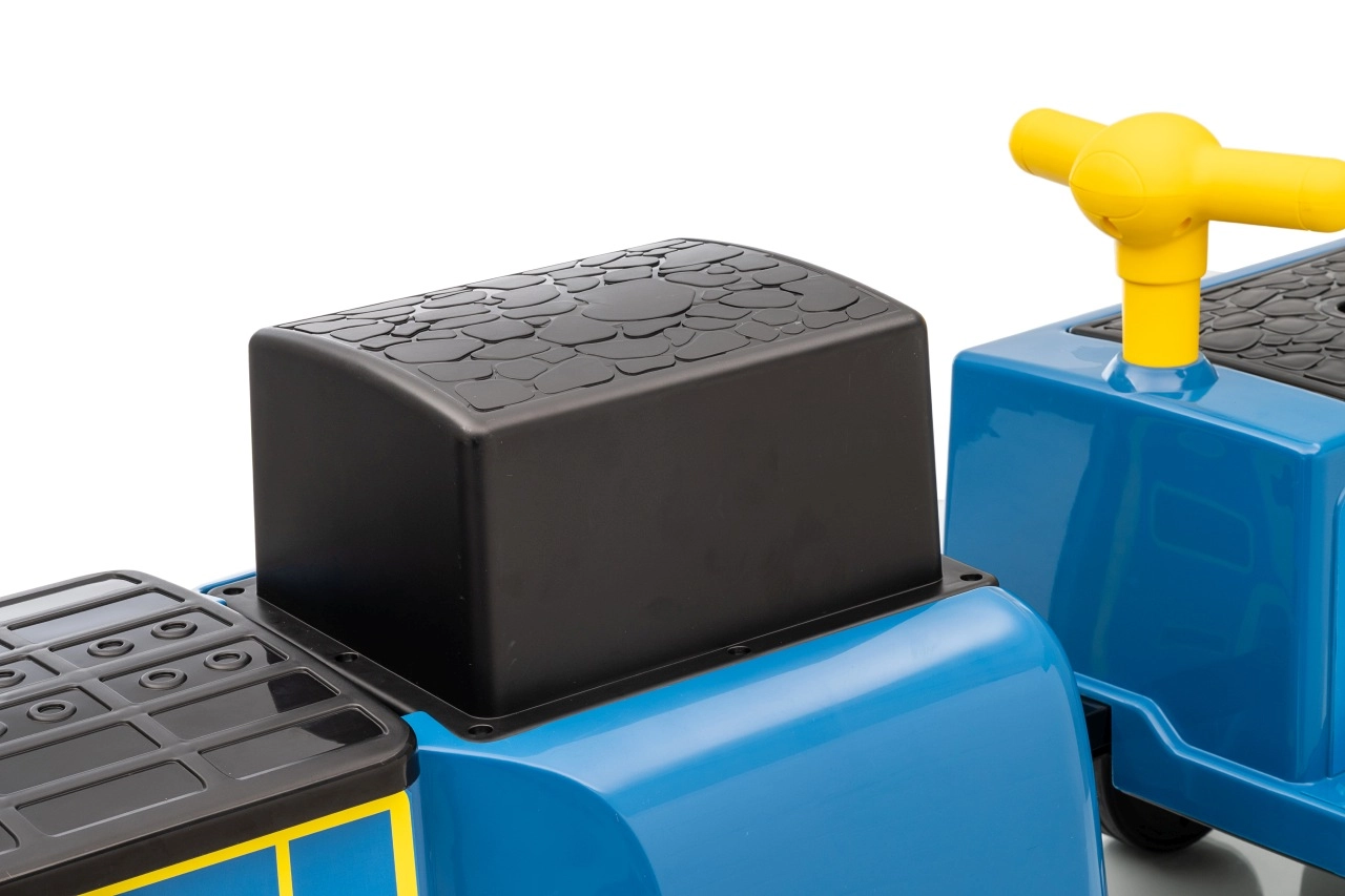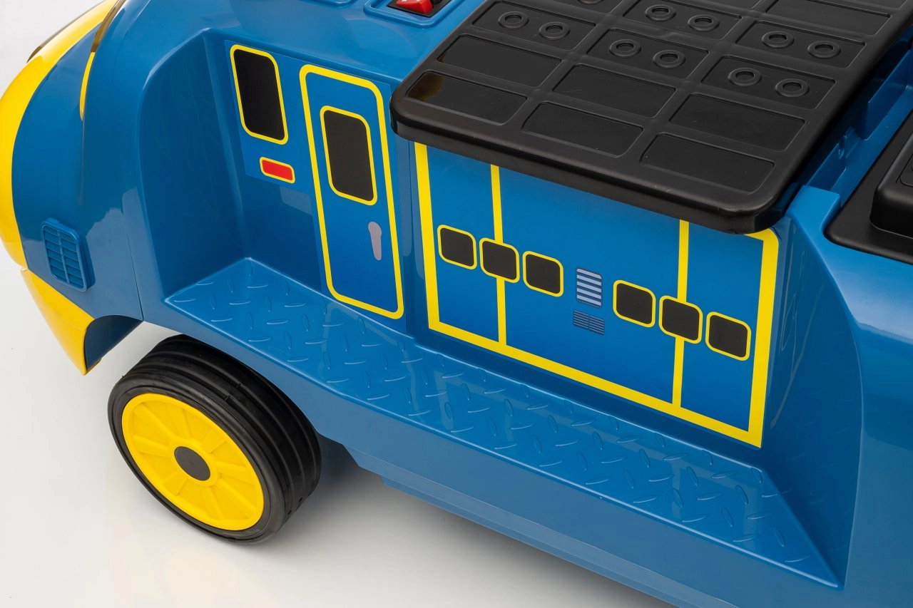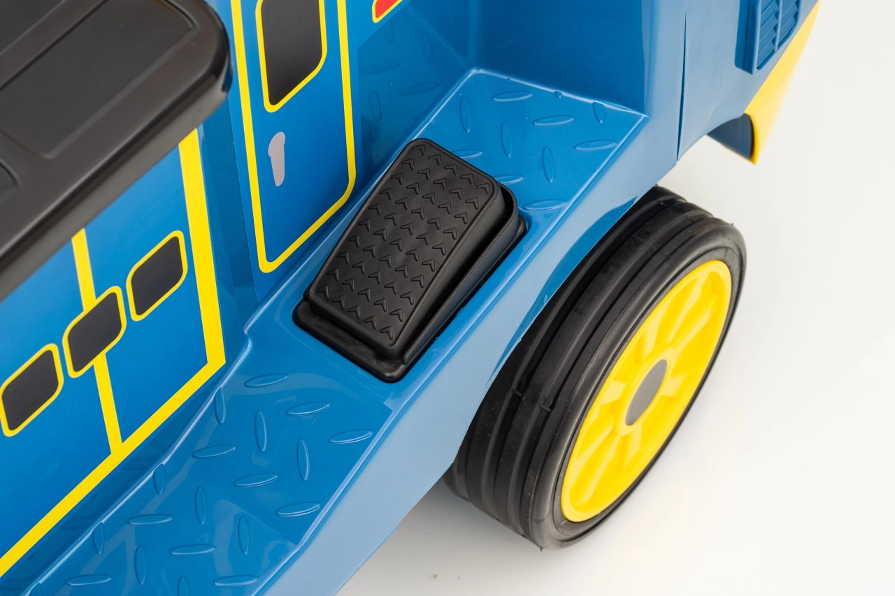 Locomotiva pentru copii STACYJKOWO îmbină distracția cu siguranța. Două motoare de 35 W și un acumulator de 12V/7Ah asigură o deplasare lină, iar pornirea lentă îi protejează pe copii de un demaraj brusc. Farurile LED frontale și designul expresiv, cu o față zâmbitoare, transformă fiecare cursă într-o aventură.