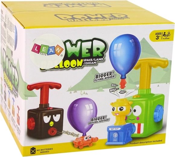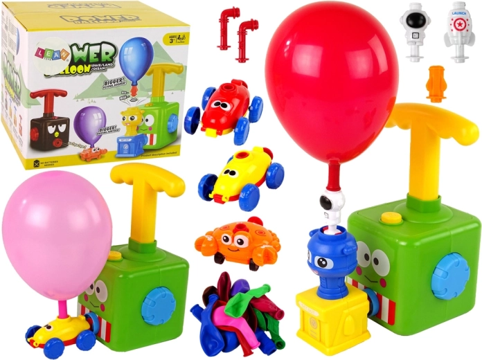 Setul conține un lansator, diverse mașinuțe (de curse și în formă de crab), conectori și baloane. Datorită operării simple, copiii învață rapid pașii: montează balonul, conectează mașinuța, pompează cu maneta și apasă butonul GO. Organizați curse acasă și vedeți care mașinuță ajunge cel mai departe!
