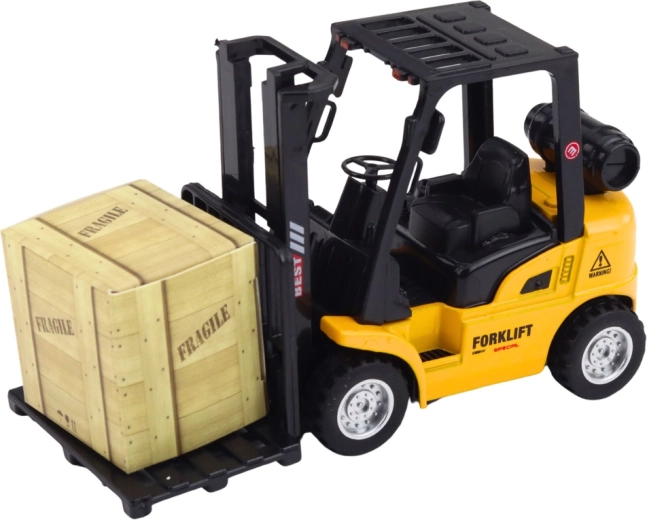 Datorită furcilor mobile (reglabile), poți ridica și coborî ușor încărcătura. În set sunt incluse și o paletă și o ladă, astfel încât copiii pot crea propriile scene de depozit, dezvoltând motricitatea fină, imaginația și coordonarea.