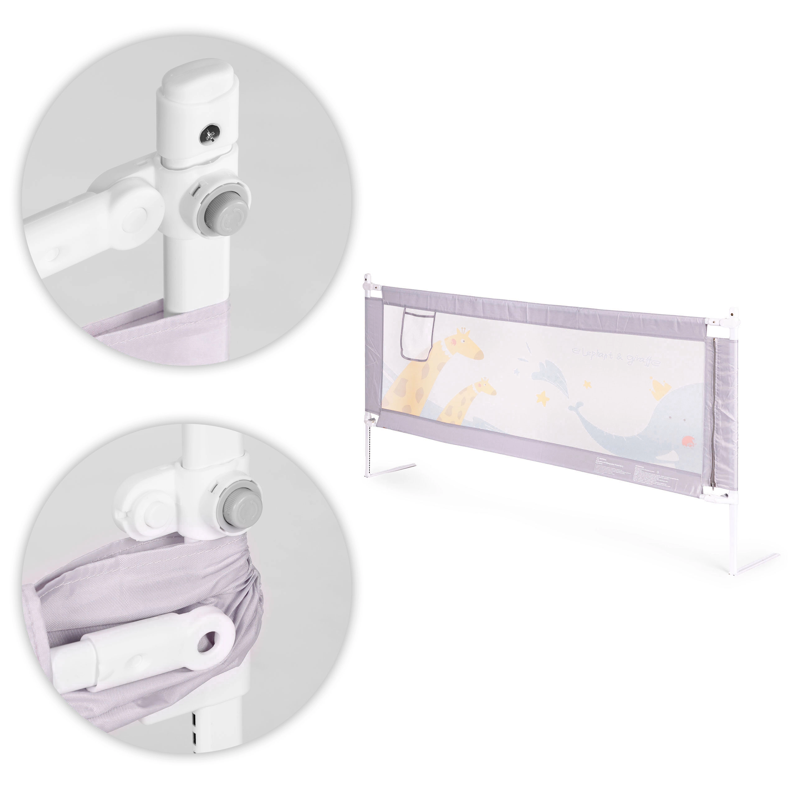 Datorită montajului universal și posibilității de conectare a mai multor bariere, creați cu ușurință un spațiu sigur și confortabil pe orice latură a patului. Materialele rezistente (oțel, țesătură 210D Oxford, poliester) garantează durată lungă de viață și întreținere facilă – husa poate fi îndepărtată și spălată. Motivul cu animale discret se potrivește camerelor de copii, iar buzunarul pentru suzetă, șervețele sau jucărie păstrează lucrurile la îndemână.