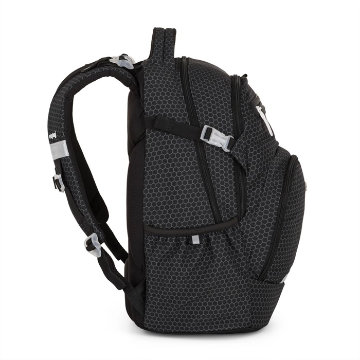 Două compartimente principale încăpătoare găzduiesc cu ușurință caiete, manuale și penarul, iar în buzunarul frontal încape o gustare mică sau alte obiecte mărunte. Buzunarele laterale din plasă cu elastic sunt ideale pentru sticla de apă, mereu la îndemână. Baza rigidă permite rucsacului să stea stabil fără să se răstoarne, în timp ce elementele reflectorizante sporesc vizibilitatea și siguranța la lăsarea serii.