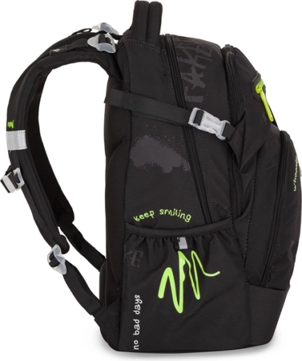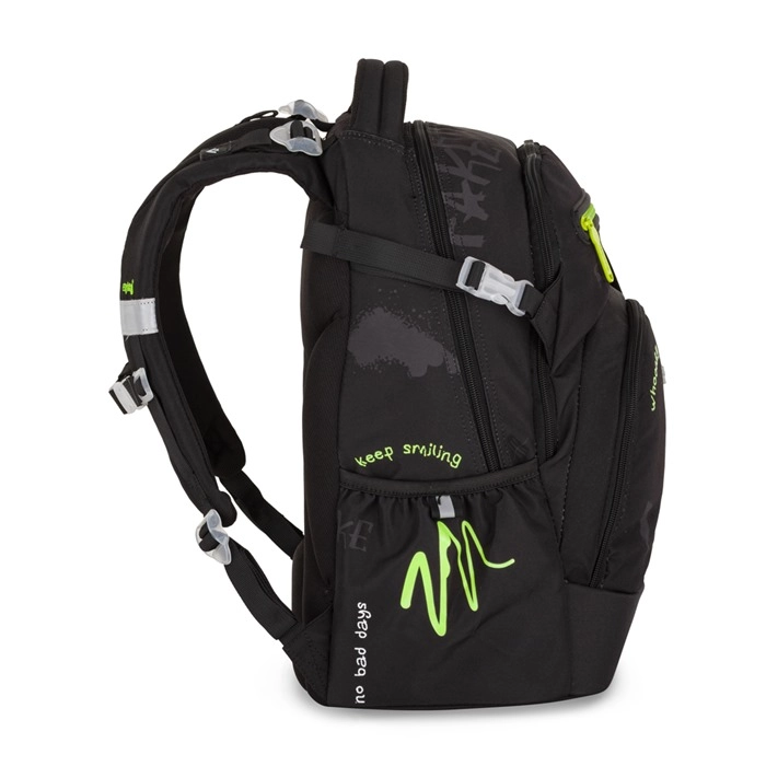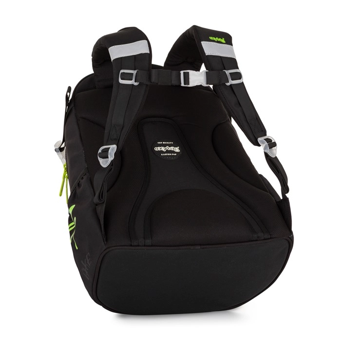 Spațiul interior include două compartimente încăpătoare pentru manuale, caiete și penar, completate de buzunar frontal pentru o gustare mică. În buzunarele laterale elastice există loc pentru sticla cu băutură, ușor de scos și pus la loc. Fundul rigid și drept permite rucsacului să stea singur și protejează conținutul împotriva răsturnării. Elementele reflectorizante sporesc vizibilitatea și siguranța pe înserat.