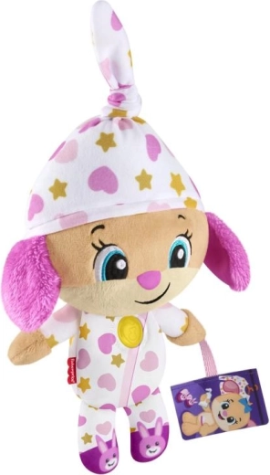 Această cățelușă moale și liniștitoare, în pijama cu steluțe și inimioare, este creată pentru ritualurile de seară. Inimioara cu lumină delicată, activată prin apăsare, pornește muzică liniștitoare, sunete blânde și fraze drăguțe, care îi ajută pe copii să se pregătească de odihnă.