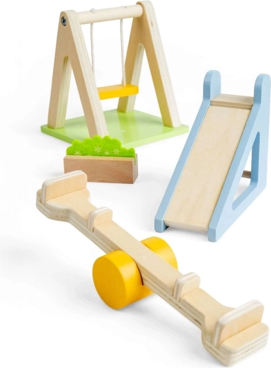 Transformați grădina casei de păpuși într-un loc plin de mișcare și imaginație. Setul include cele mai îndrăgite elemente ale terenului de joacă – leagăn, tobogan, balanță (see-saw) și un decorativ strat de flori. Datorită pieselor din lemn neted, în culori pastelate, manipularea este plăcută și sigură.