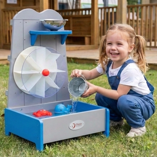Roata hidraulică din lemn este alegerea ideală pentru grădină, terasă sau balcon. Copiii toarnă apă în bolul/pâlnia metalică, fluxul cade pe palete și pune în mișcare roata mare. Capacul transparent protejează mecanismul și permite observarea în siguranță. Rezervorul inferior colectează apa pentru joacă repetată – economic și ecologic.