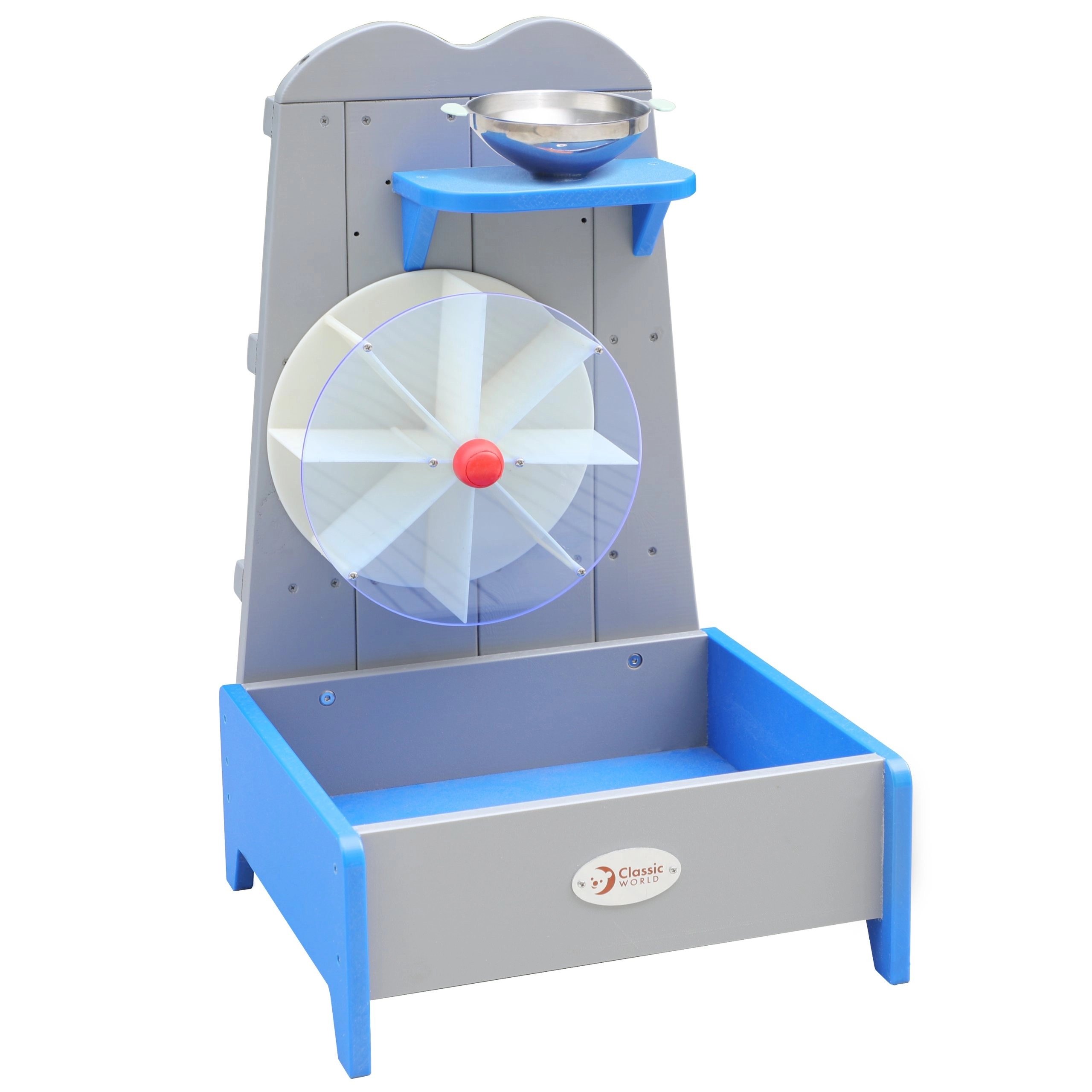 Toarnă apă în pâlnia metalică și urmărește cum fluxul pune în rotație roata mare cu palete. Copiii însușesc principiile curgerii apei și ale energiei cinetice într-un mod distractiv.