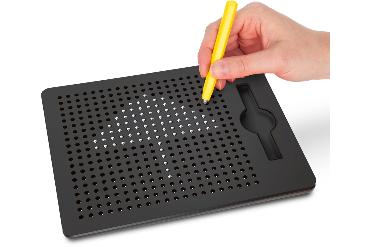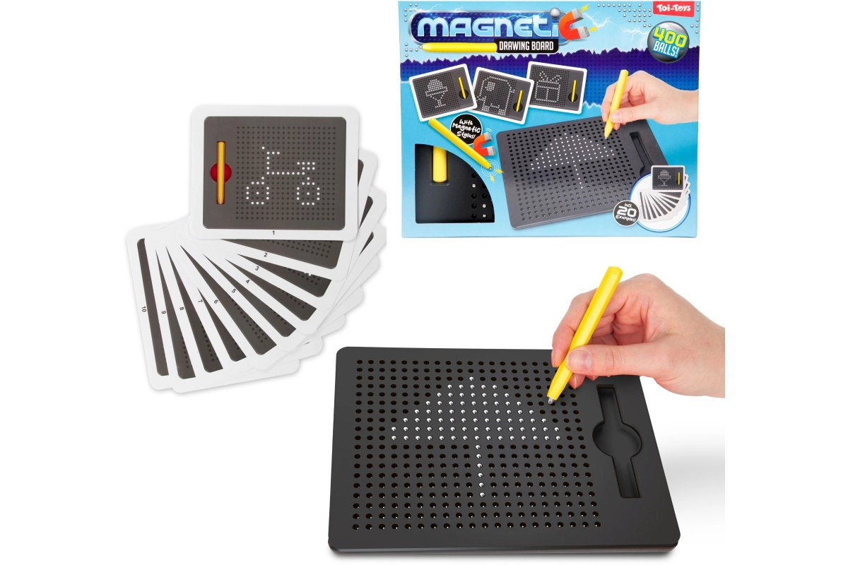 Această tablă magnetică le permite copiilor să deseneze cu ajutorul unui stilou magnetic care ridică bilele metalice la suprafață, creând imagini punctate precise. Fără cerneală și fără mizerie – ideală pentru utilizare repetată și joacă creativă.