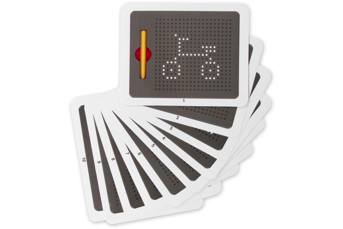 Pachetul include un set de 20 de carduri cu modele pentru începuturi ușoare. Copiii pot contura formele și pot învăța pas cu pas.