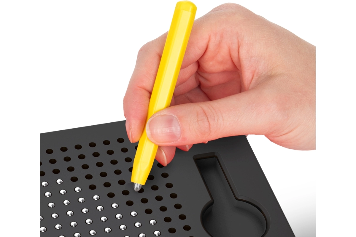Stiloul magnetic ridică bilele la suprafața tablei, astfel încât copiii creează curat și repetat – fără hârtie, culori și pete.