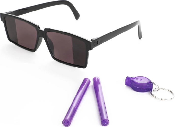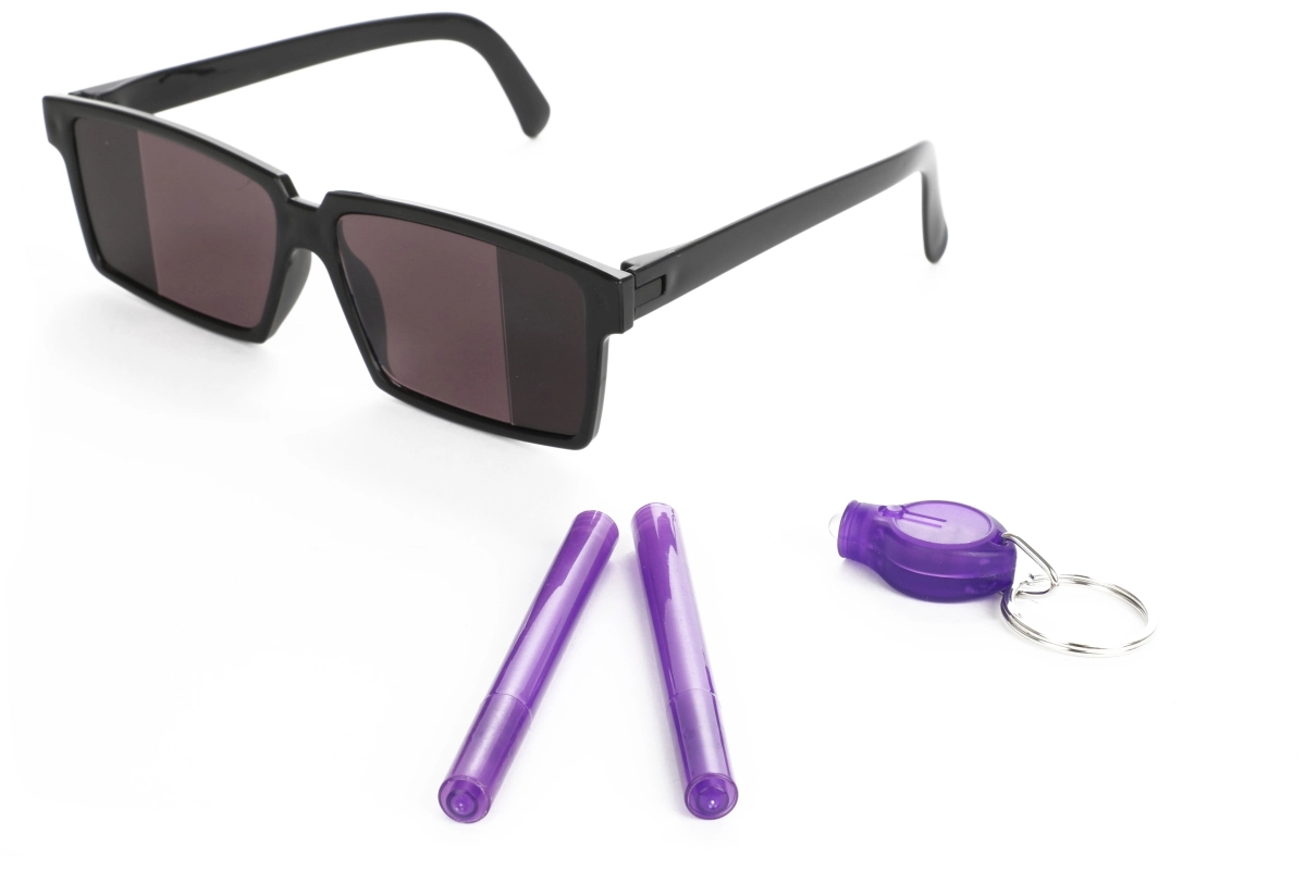 - 2 pixuri invizibile (magice), lanternă UV, ochelari speciali