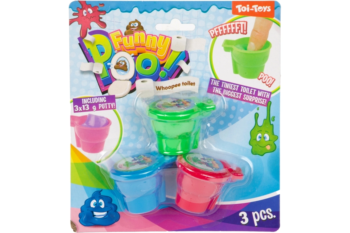 Conținutul pachetului este format din trei bucăți de slime în mini toalete din plastic. Materialul este ușor de modelat, distractiv de strâns și potrivit pentru joacă scurtă și relaxantă. Ambalajul pe carton facilitează expunerea și dăruirea.
