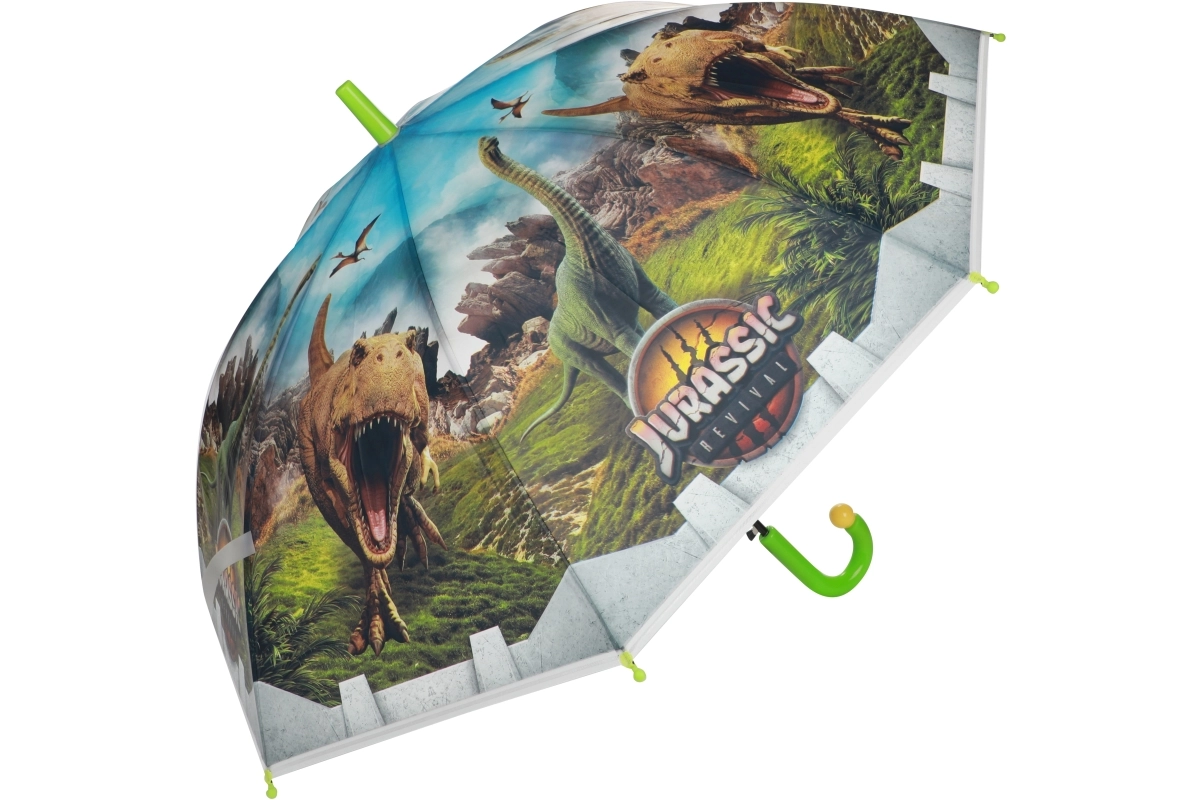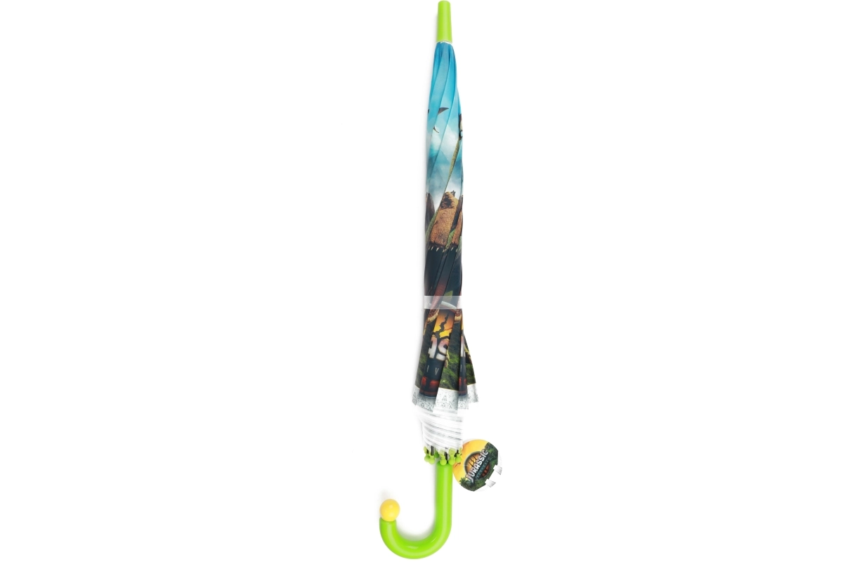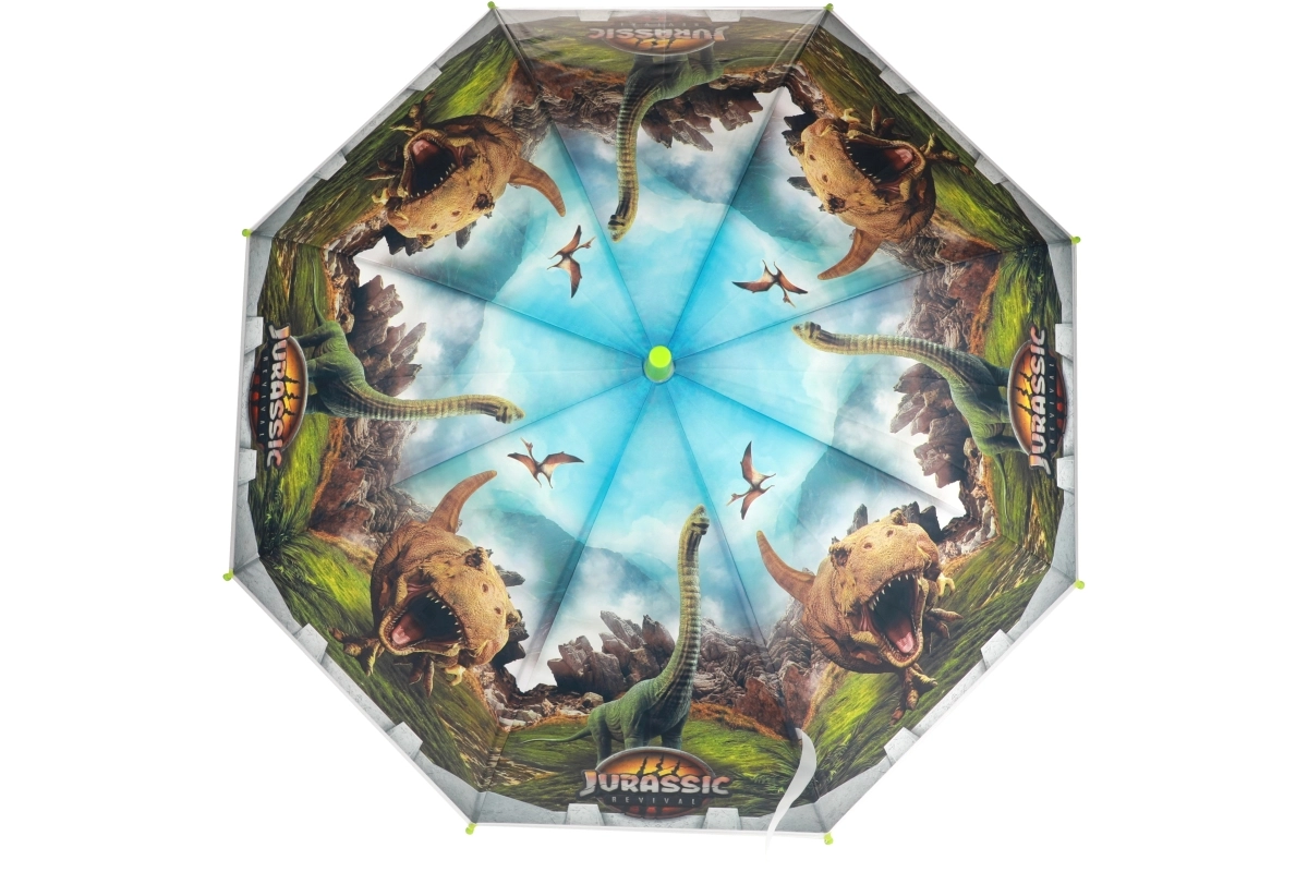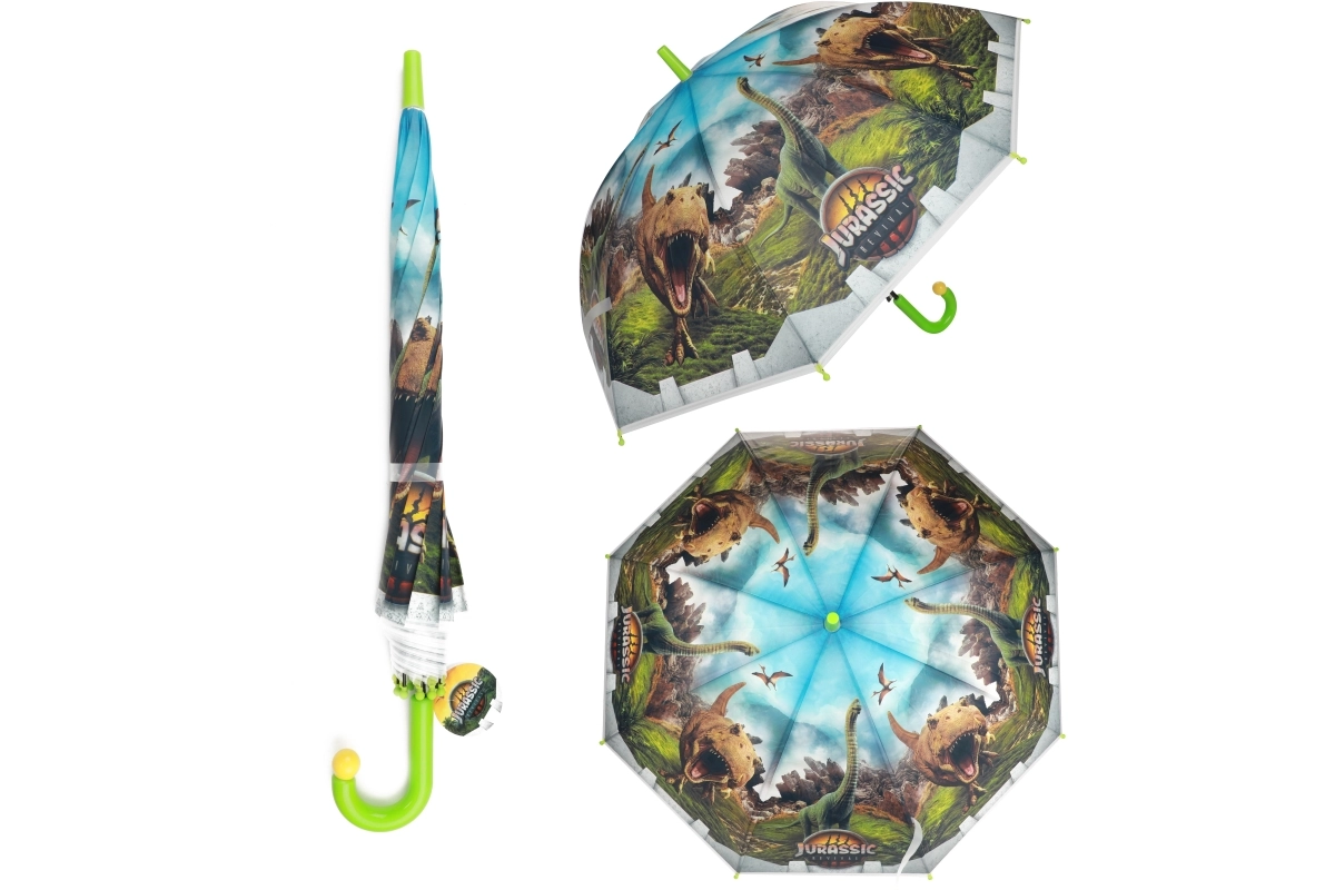 O umbrelă stilată pentru copii cu motiv Jurassic World și dinozauri îi protejează pe micii aventurieri de ploaie. Oferă deschidere manuală tip „shoot”, structură robustă cu spițe metalice și capete de siguranță rotunjite. Datorită lățimii de 80 cm și mânerului ergonomic curbat, se ține confortabil și protejează fiabil împotriva intemperiilor.