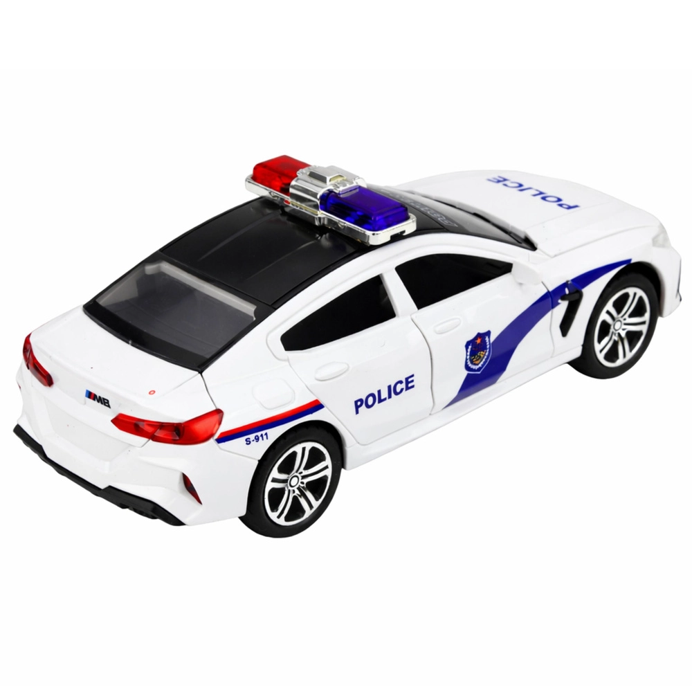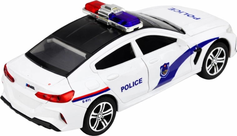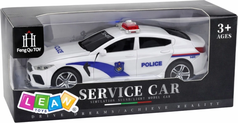 Mașina de poliție albă realistă oferă distracție plină de acțiune cu efecte de lumină și sunet, uși din față care se deschid și mecanism de rulare înainte prin împingere. Detaliile fidele cu inscripții POLICE, girofar roșu-albastru și construcție rezistentă îi vor încânta pe micii pasionați de vehicule de serviciu.