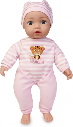Păpușa Natalia – bebeluș funcțional cu înălțimea de 45 cm oferă copiilor o experiență autentică de îngrijire a unui bebeluș. Printr-o simplă apăsare a burticii se activează sunete drăgălașe care susțin interacțiunea și jocul de rol în familie.