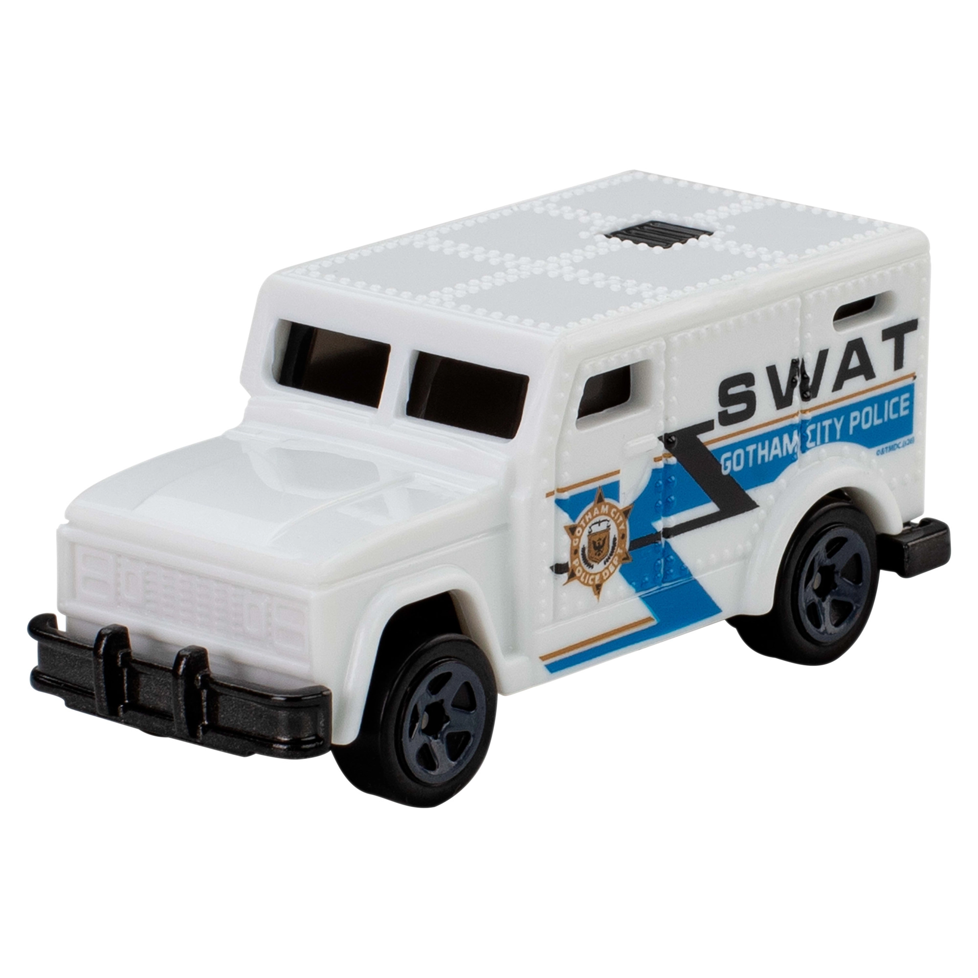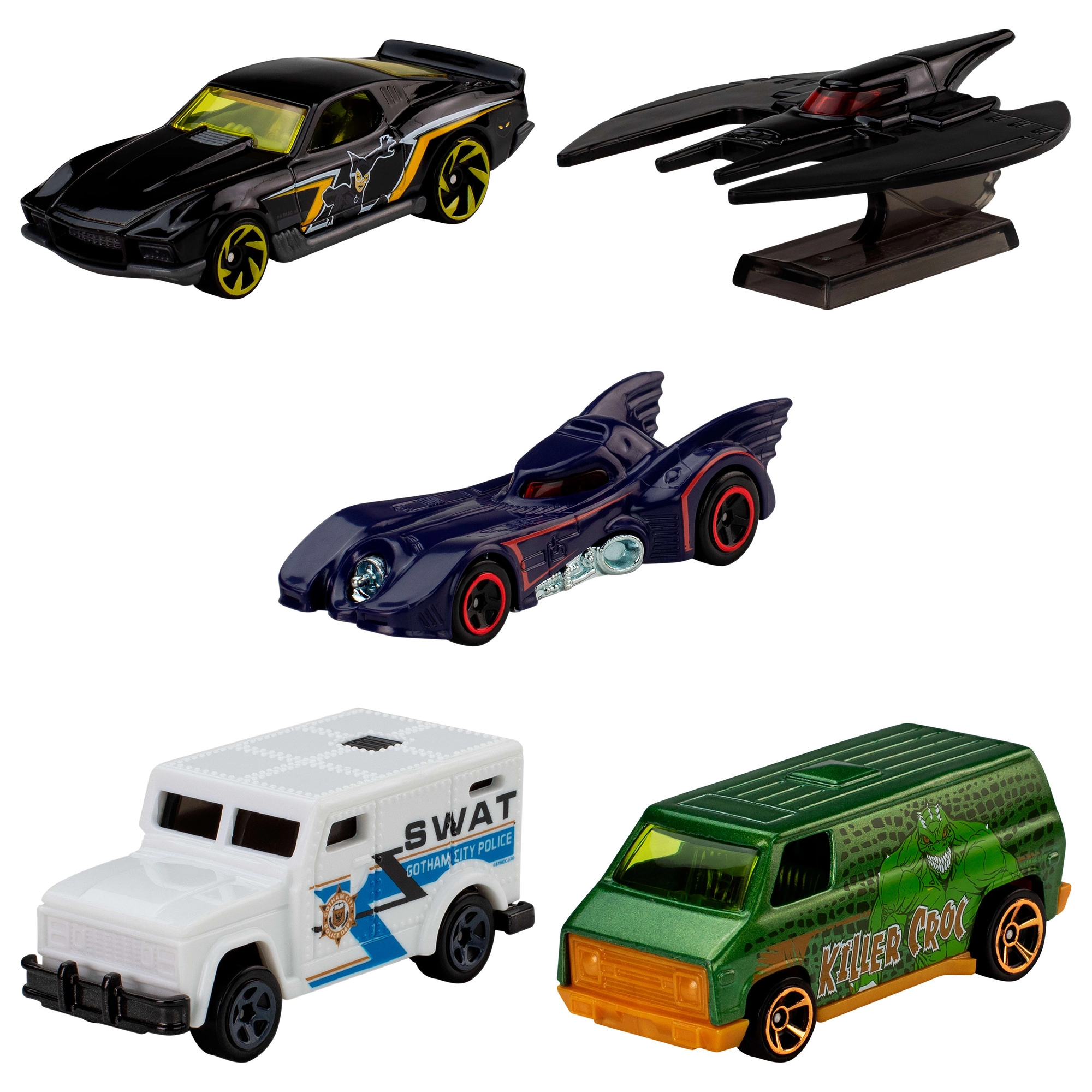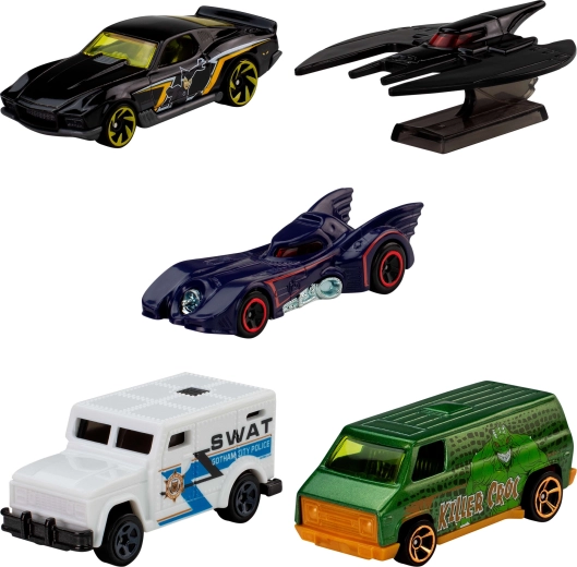 Cinci modele metalice detaliate la scară 1:64 acoperă atât eroi, cât și răufăcători din Gotham – ideal pentru fanii DC și Hot Wheels.