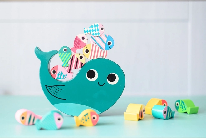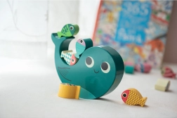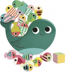 Puneți peștișorii pe balenă astfel încât să nu se răstoarne! Acest joc nu este doar o distracție grozavă, ci stimulează și abilitățile motorii fine și coordonarea vizuală-motorie la copii. Materialele de calitate și abordarea ecologică de producție asigură că jocul este nu doar sigur, ci și prietenos cu mediul.