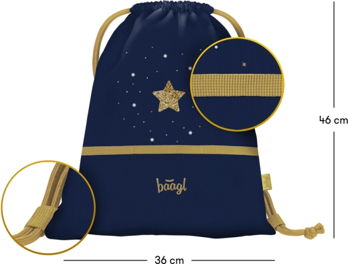 Săculețul stilat BAAGL cu design Unicorn Gold este ideal pentru încălțăminte și mărunțișuri pentru timpul liber. Oferă material rezistent și ușor de curățat, închidere prin șnururi pentru purtare pe spate și o carabină practică pentru prindere de ghiozdan.