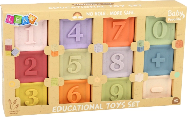 Fiecare cub poartă cifrele 0–9 în relief și simboluri matematice de bază, care îi ajută pe copii să înțeleagă numărarea și operațiile simple într-un mod natural și jucăuș.