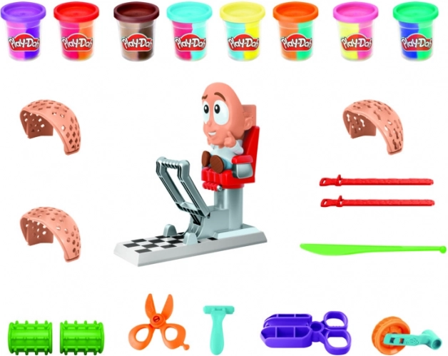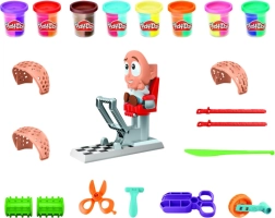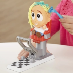 - Figurină cu scaun, bază de presare, foarfecă, pieptene, forme, recipiente cu pastă de modelat Play-Doh (mai multe culori)