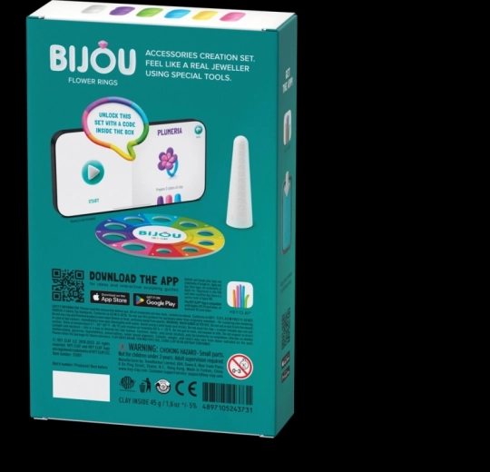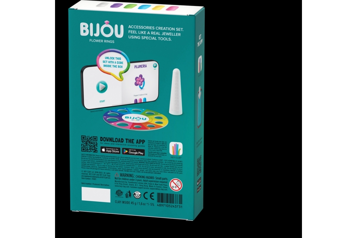 - 3 recipiente cu pastă modelatoare moale și ușoară, 2 baze pentru inele, instrument special de modelare, cod de acces la aplicația HEY CLAY
