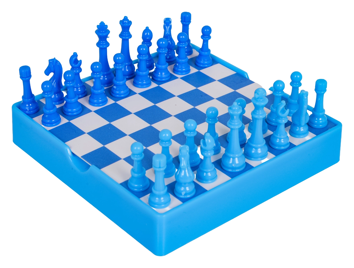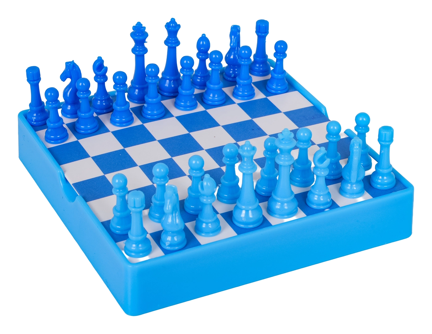 Tabla de șah din plastic cu margini ridicate și piesele în două nuanțe de albastru asigură manipulare ușoară și durată lungă de viață.