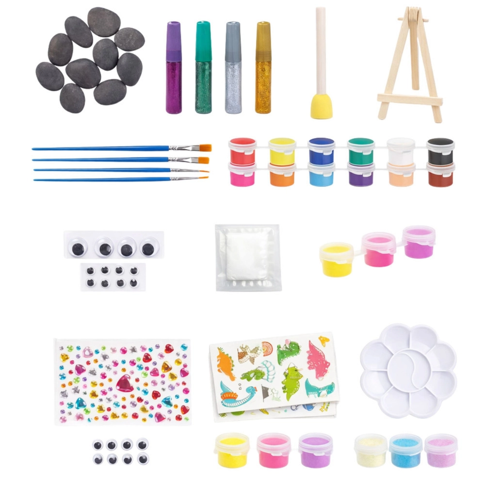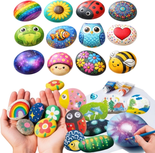 Pietre netede, culori acrilice vii, sclipici, pensule, paletă, autocolante și ochișori – totul într-o singură cutie, gata de pictat.