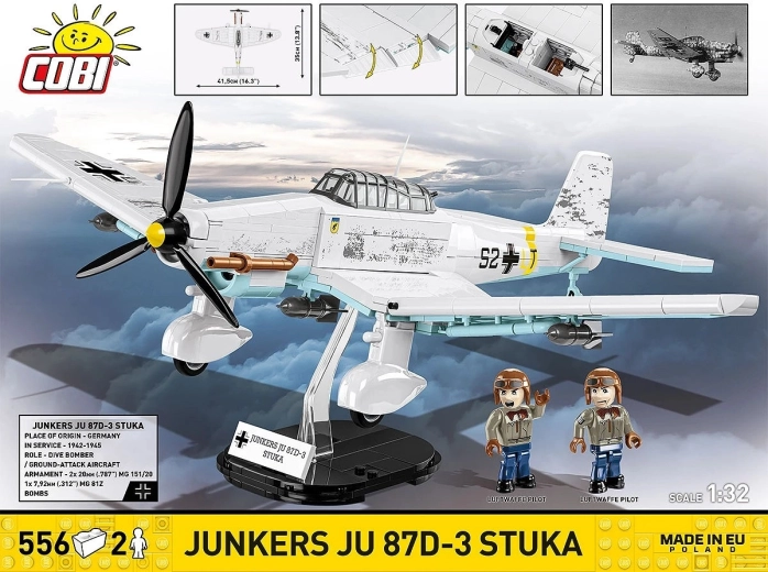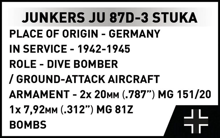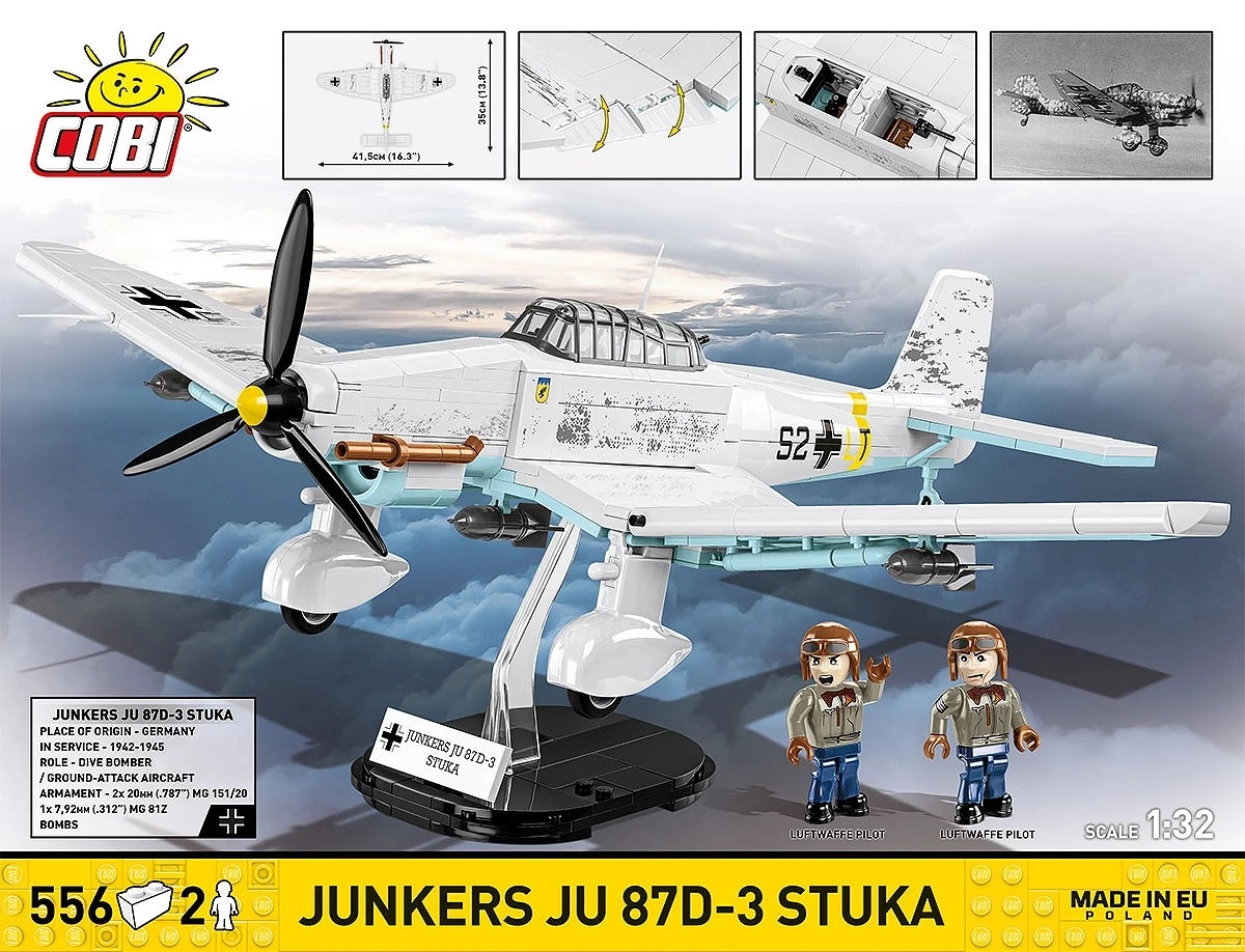 Sunt incluse 2 minifigurine ale echipajului și un suport negru cu denumirea „Junkers Ju 87D-3 Stuka” pentru o expunere atrăgătoare a modelului în „zbor”.