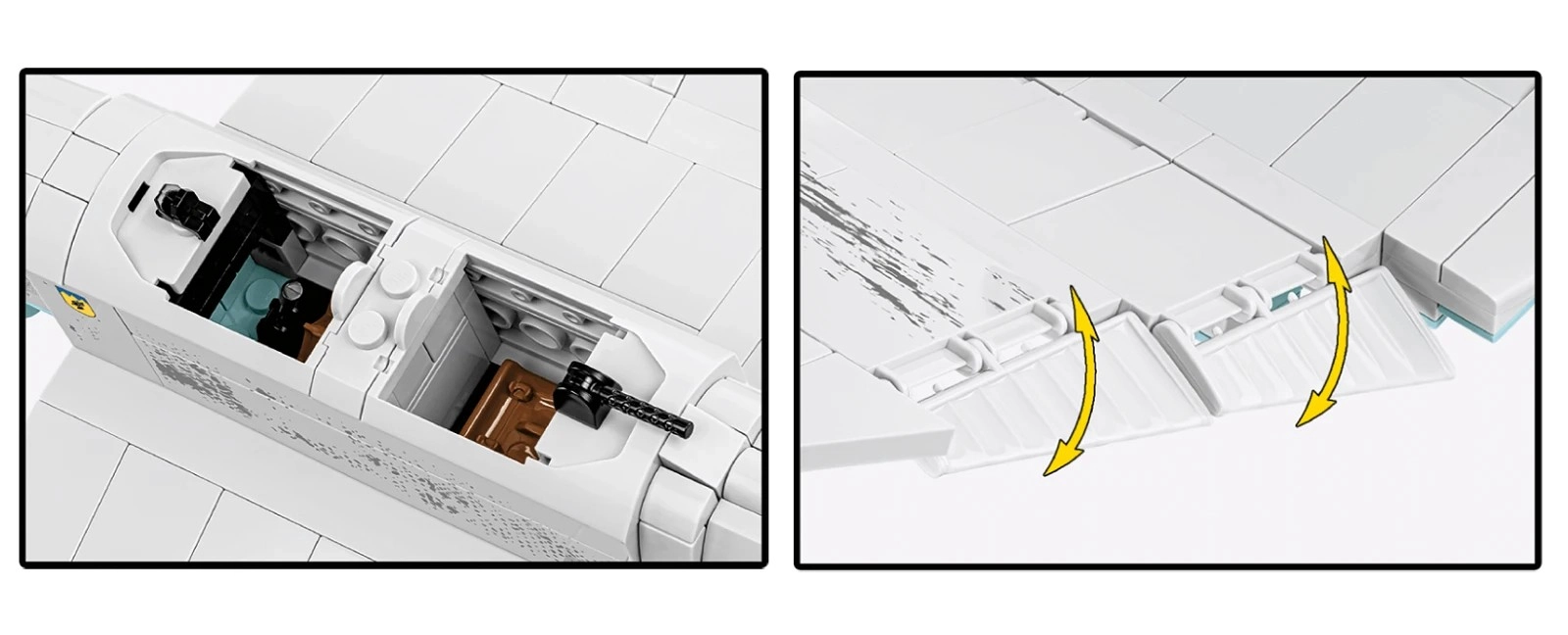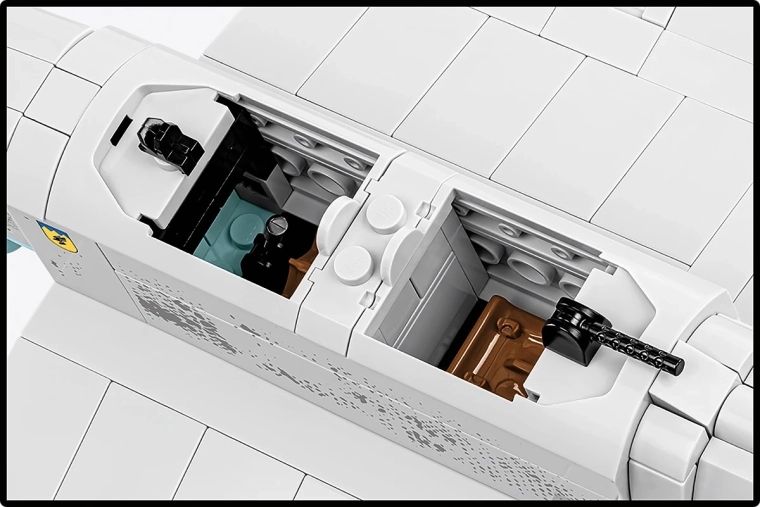 Setul pune accent pe joacă și expunere: cockpitul care se deschide permite așezarea piloților la interior, elica se rotește, roțile cu anvelope din cauciuc se învârt lin, iar suprafețele mobile oferă dinamism modelului. Suportul special cu numele aeronavei subliniază caracterul de colecție și permite expunerea modelului „în zbor”.