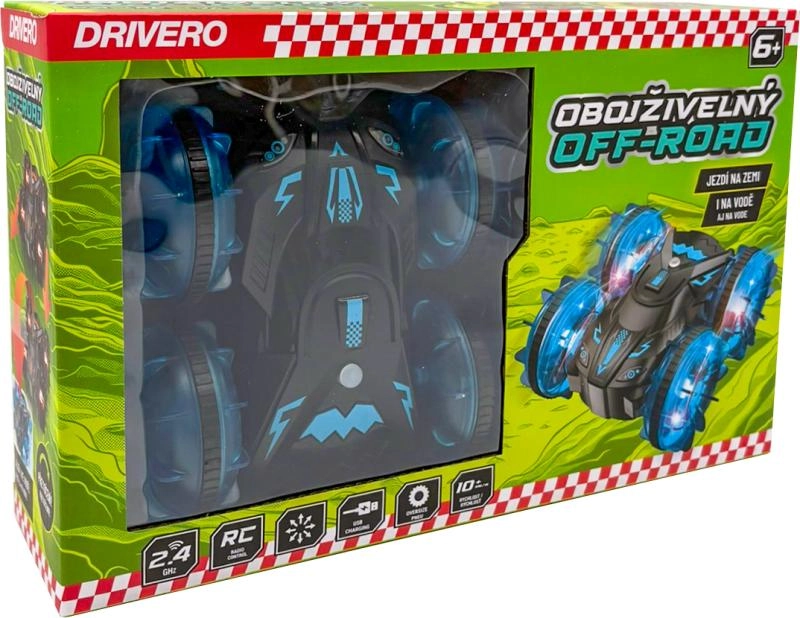 Off-road-ul RC amfibiu DRIVERO este alegerea ideală pentru distracție în orice mediu – face față bălților, piscinei și terenului mai dificil din grădină. Controlul intuitiv și materialele rezistente asigură o rulare fără griji, în timp ce roțile transparente cu iluminare LED creează un spectacol luminos grozav la lăsarea serii.