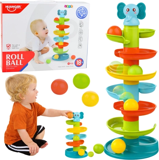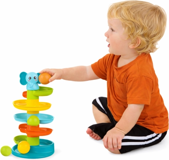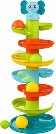 Șapte niveluri colorate creează o spirală fluidă. Cursa lungă a bilelor îi distrează pe copii și îi învață principiile cauzei și efectului.