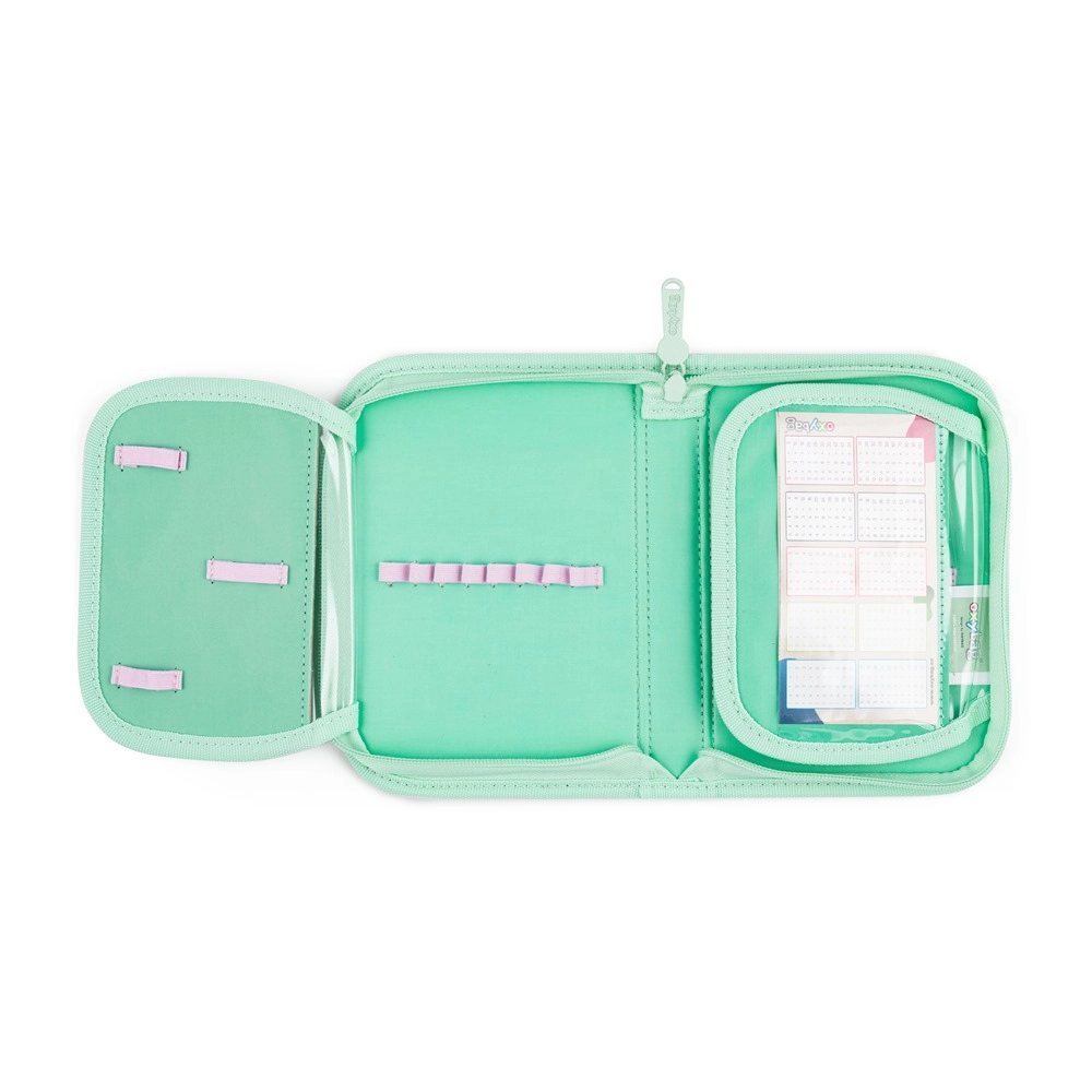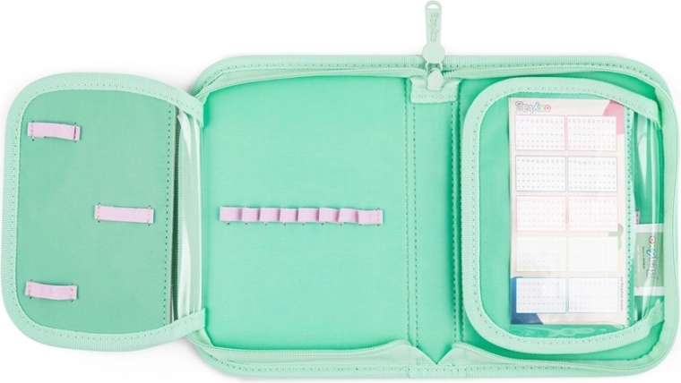 Sacul cu închidere prin șnur este ideal pentru orele de sport și timpul liber. Penarul cu două clapete oferă bride pentru creioane și folie transparentă pentru orar.