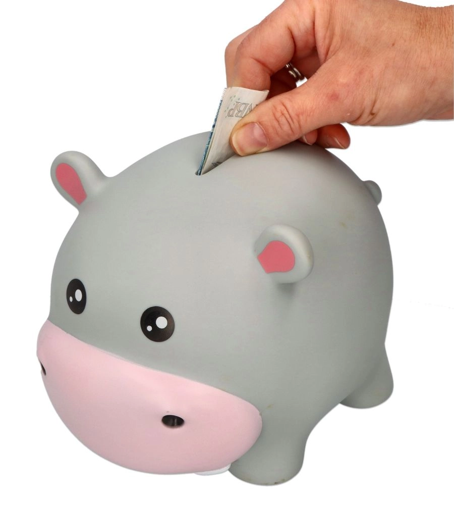 Această pușculiță încântătoare în formă de hipopotam motivează la economisire distractivă. Materialul PVC de calitate asigură durabilitate îndelungată, forme rotunjite netede și utilizare sigură în mediul pentru copii. Datorită fantelor practice din partea superioară, introduceți cu ușurință monedele și bancnotele pliate.