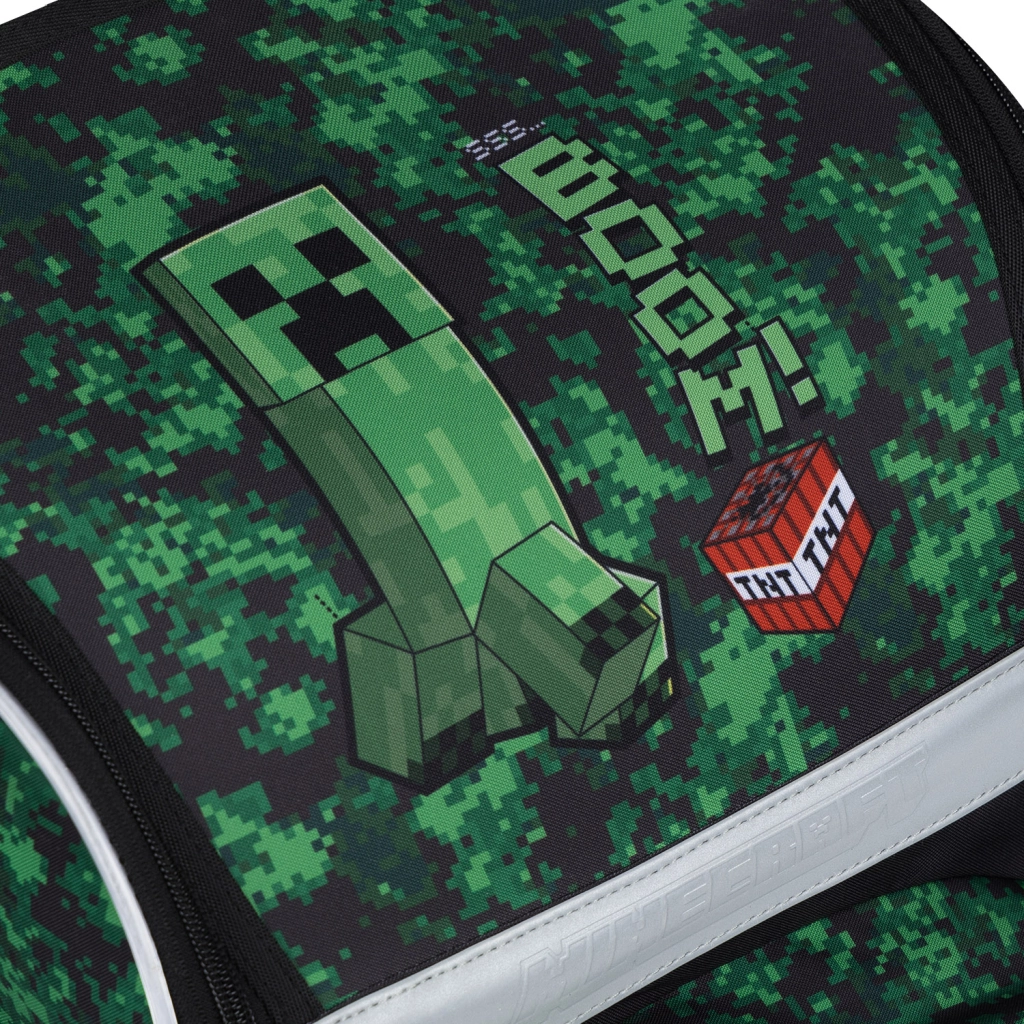 Întregul set este decorat cu motive de joc MINECRAFT, cu camuflaj pixelat și elemente reflectorizante pentru vizibilitate sporită. Fermoarele YKK asigură durabilitate îndelungată și închidere/deschidere lină, în timp ce materialele reciclate și impermeabile rezistă ritmului solicitant al școlii.