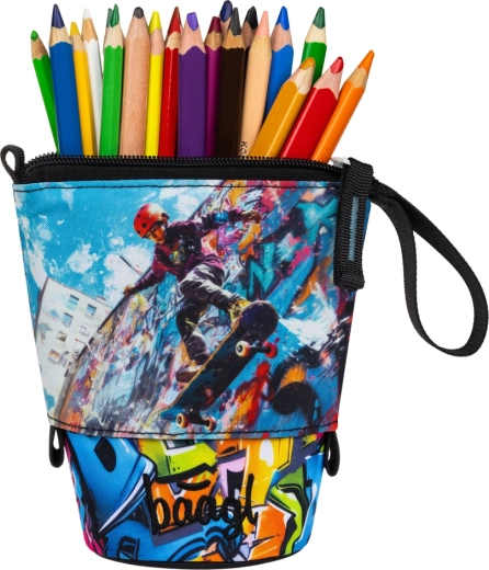 Construcția unică se transformă rapid într-un suport, astfel că nu este necesar să vărsati accesoriile – este suficient să trageți și puteți scrie sau desena. În interior se află, în plus, un buzunar secret pentru ascuțitoare, gumă sau mărunțișuri pe care doriți să le aveți mereu la îndemână.