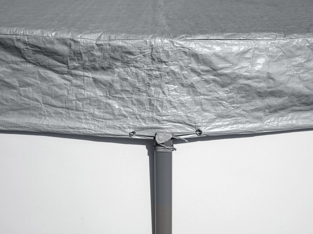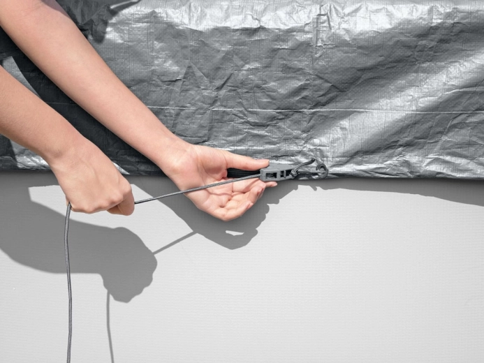 Mecanismul de strângere și șnurul de reglare mențin husa fixă pe poziție și îmbunătățesc aderența pe întregul perimetru al piscinei.