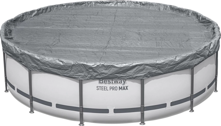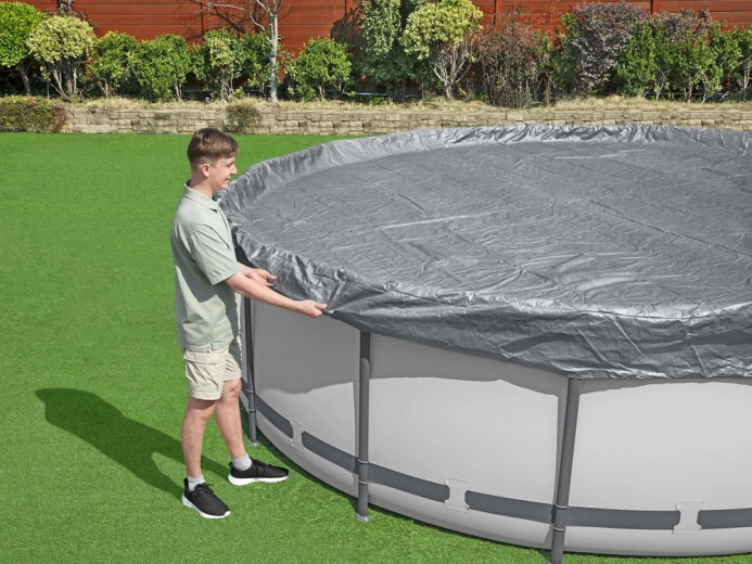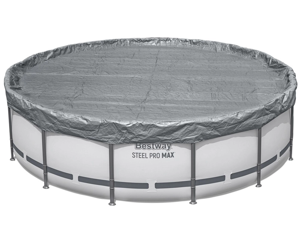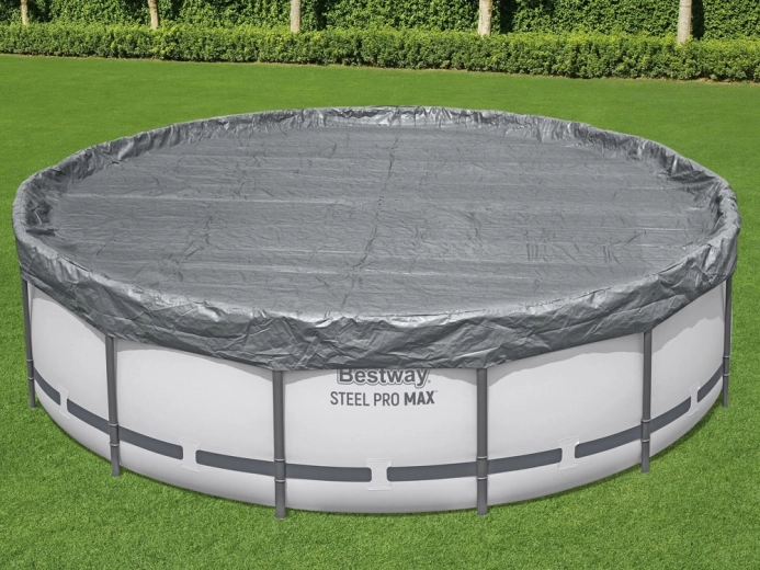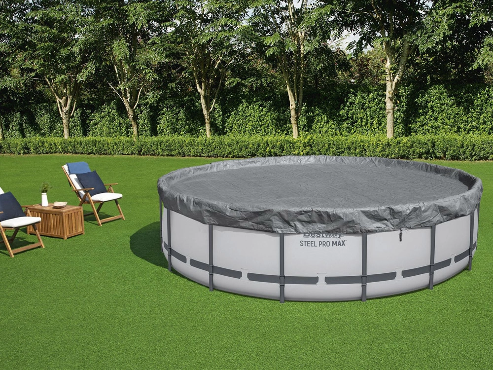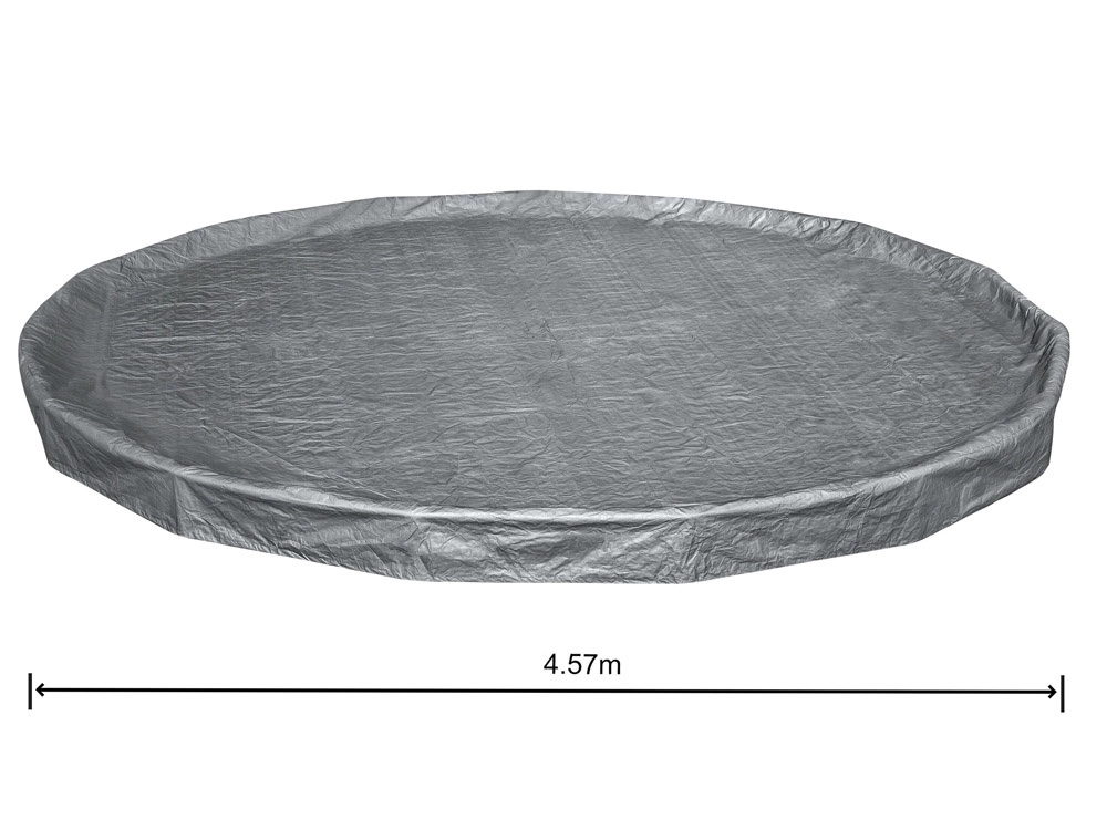 Prelată rezistentă pentru piscină cu diametrul de 4,57 m protejează apa de frunze, iarbă și impurități. Este fabricată din material ranforsat cu protecție UV, are sistem de strângere rezistent la vânt pentru fixare fermă și orificii de drenaj împotriva acumulării apei de ploaie. Datorită tehnologiei Polar‑Shield rezistă și la temperaturi scăzute până la −25 °C.