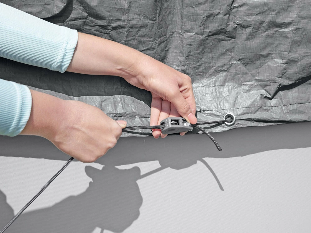 Datorită tratamentului de suprafață Polar‑Shield, prelata este potrivită pentru utilizare pe tot parcursul anului și își păstrează proprietățile chiar și la îngheț până la −25 °C. Sistemul de strângere rezistent la vânt menține prelata ferm pe poziție și reduce la minimum riscul ridicării de către vânt.