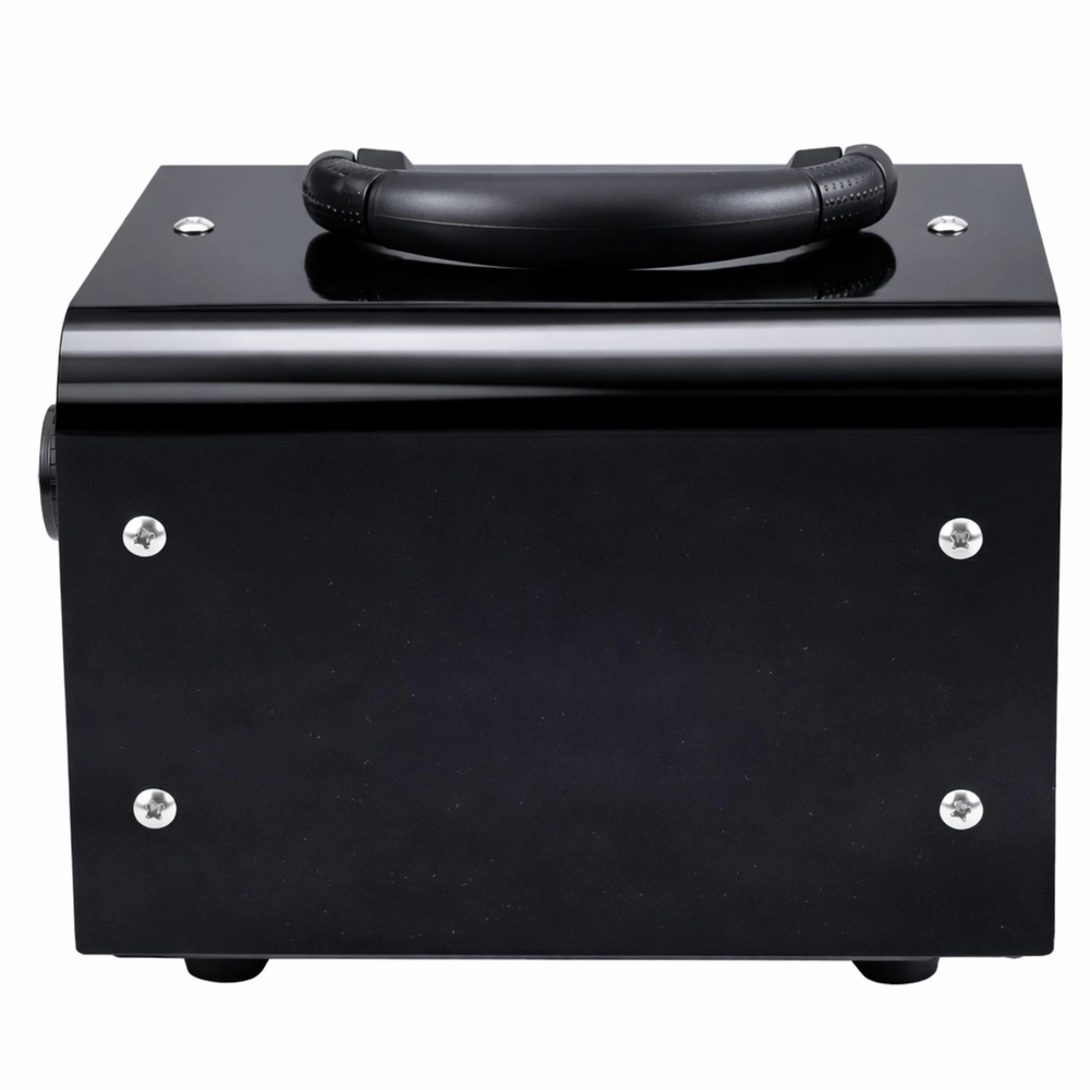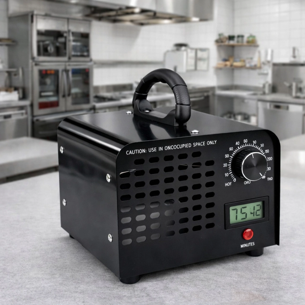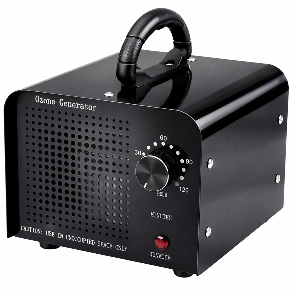 Controlul este extrem de simplu – temporizatorul mecanic 1–120 minute permite adaptarea ciclului la dimensiunea spațiului și la gradul de contaminare. După expirarea timpului setat, dispozitivul se oprește automat. Construcția metalică masivă, picioarele stabile și ventilatorul încorporat asigură o durată lungă de viață și o distribuție uniformă a ozonului.