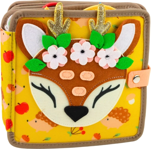 Cartea senzorială colorată din fetru moale, cu motiv de căprioară și animăluțe, aduce copiilor învățare prin joacă. Susține motricitatea fină, coordonarea mână–ochi, recunoașterea culorilor și formelor și imaginația. Elementele interactive precum mutarea formelor, șireturi de tras prin orificii și înșiretare mențin atenția și motivează la explorare.