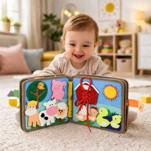 Această quiet book moale și ușoară este concepută pentru mânuțe mici. Pe pagini, copiii găsesc animale de fermă și de pădure, copac, soare, hambar și alte elemente din fetru care pot fi desprinse, mutate, introduse în buzunărașe și legate. Prin joacă, antrenează abilități necesare vârstei preșcolare.