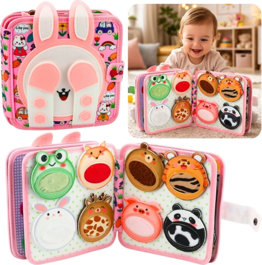 Descoperă cartea senzorială jucăușă din fetru moale, cu motivul unui iepuraș roz, care susține motricitatea fină, dezvoltarea senzorială și învățarea culorilor și formelor. Datorită elementelor mobile și detașabile, copiii își antrenează coordonarea mână–ochi și capacitatea de concentrare, bucurându-se de un joc sigur și silențios, acasă sau în călătorii.
